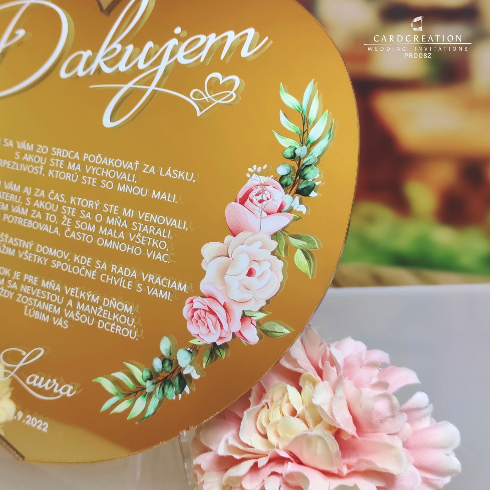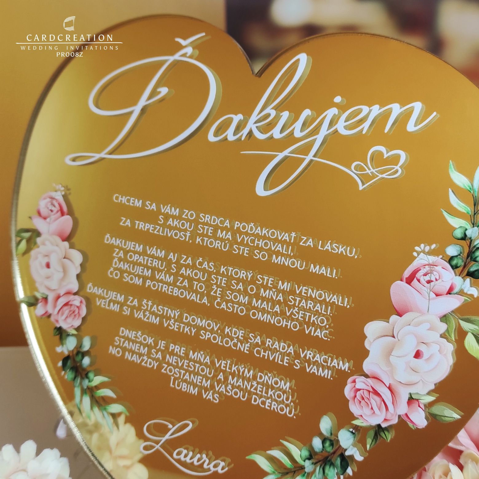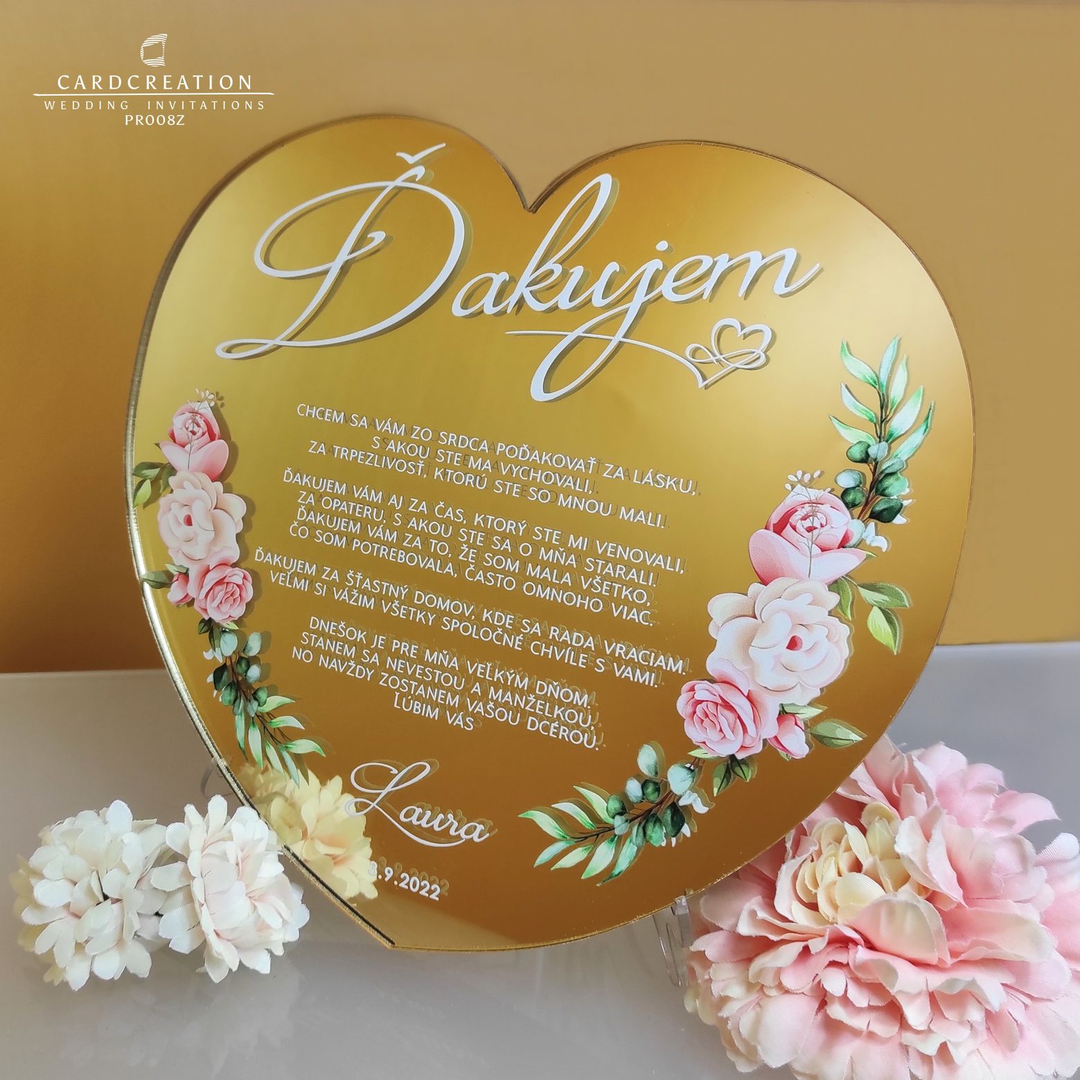 Poďakovanie tlačíme na zlaté zrkadlo s využitím najnovších technológii ako je plastická „3D“ tlač s potlačou najvyššej kvality. Tlačíme v najvyššej kvalite s použitím až 8 farieb ( CMYK,LC,LM+ biela+lak). Farby sú krásne živé, stále a časom nevyblednú , sú odolné voči vode a mechanickému poškodeniu. Samotné srdiečko vyrezávame pomocou presného lasera.
