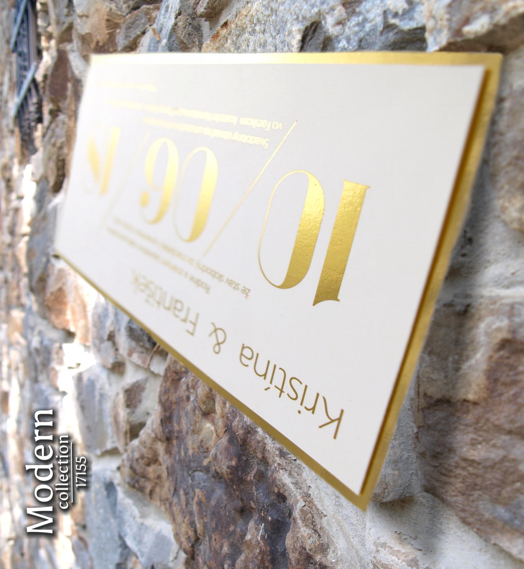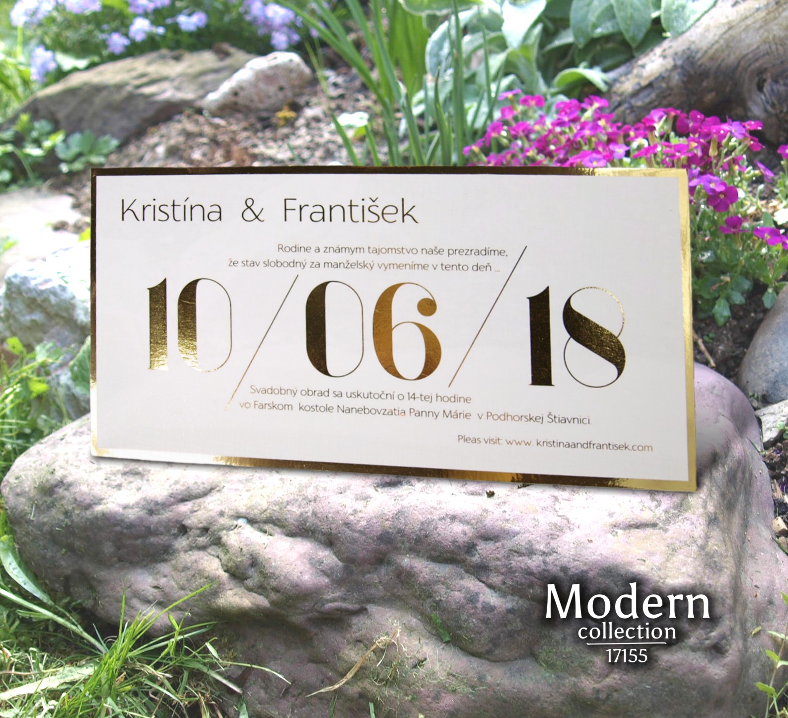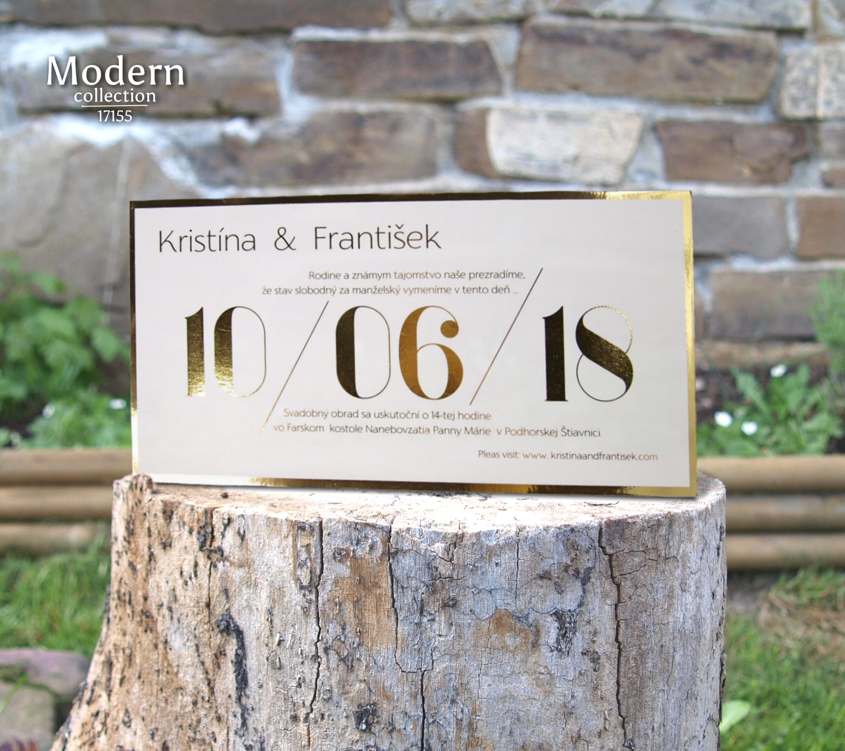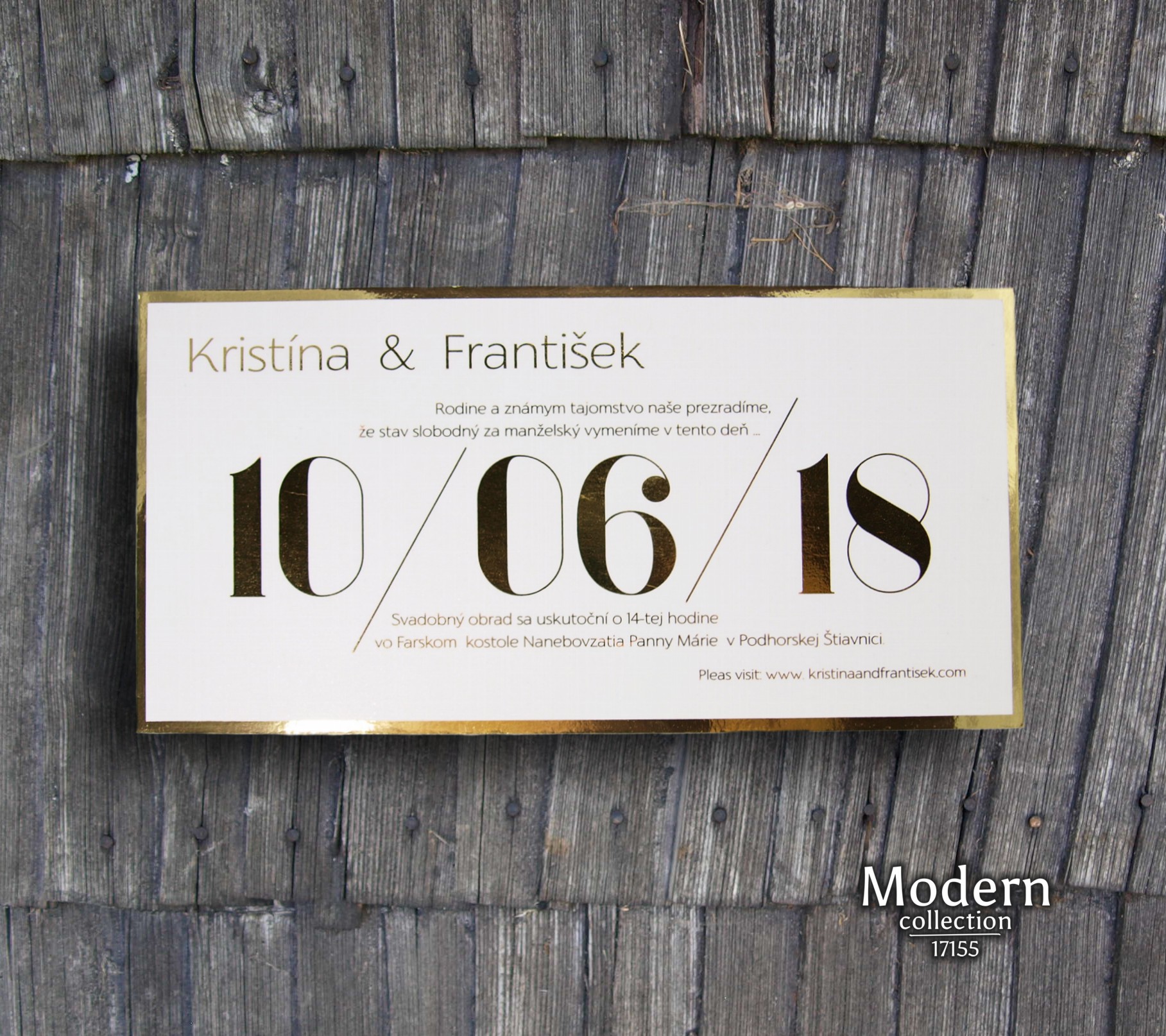 Moderné svadobné oznámenie tlačené zlatou fóliou na luxusnom bielom kreatívnom papieri s jemnou perleťou. Oznámenie sa skladá z dvoch zlepených kartičiek-spodný papier je zrkadlovo zlatý luxusný kartón. K oznámeniu sa v tomto štýle vyrábajú aj ostatné tlačoviny na svadbu.