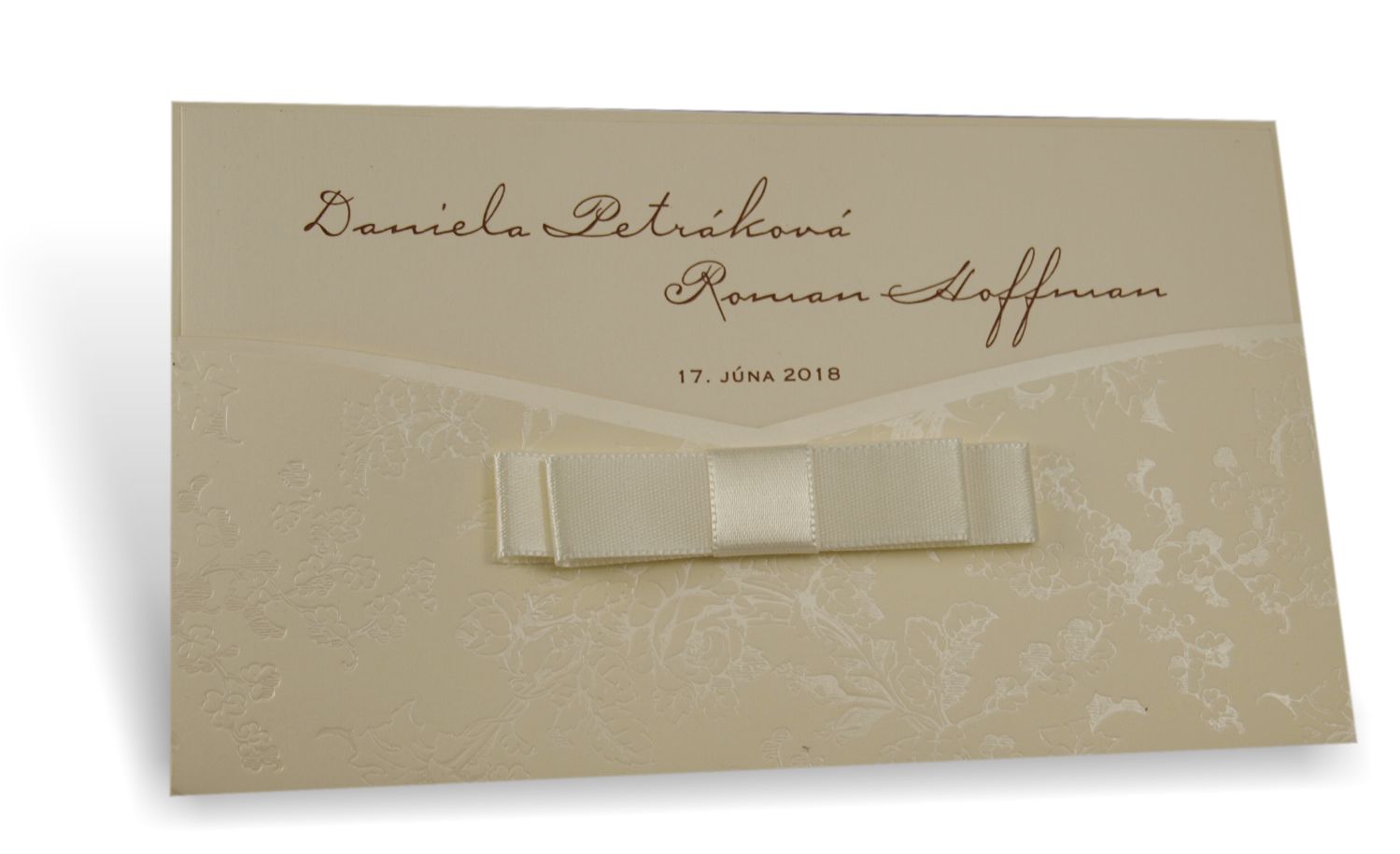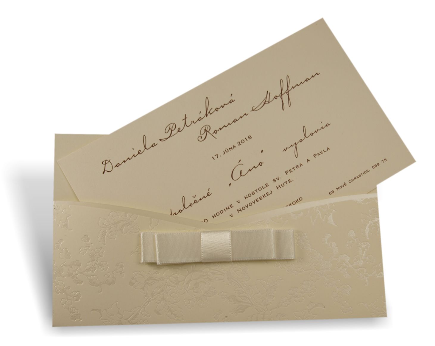 Oznámenie z prírodného krémového papiera. Obal oznámenia s ražbou ornamentov perleťovou fóliou. Obal je dozdobený mašľou. Tlač textov efektnou termogravúrou. K oznámeniu sa v tomto štýle vyrábajú aj ostatné tlačoviny na svadbu.