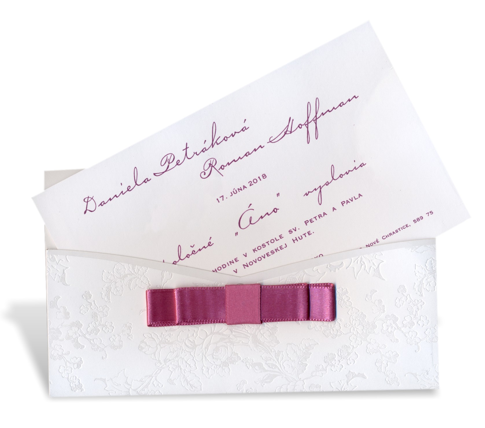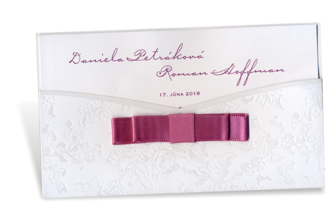 Oznámenie z bieleho papiera. Obal oznámenia s ražbou ornamentov perleťovou fóliou. Obal je dozdobený mašľou. Tlač textov efektnou termogravúrou. K oznámeniu sa v tomto štýle vyrábajú aj ostatné tlačoviny na svadbu.