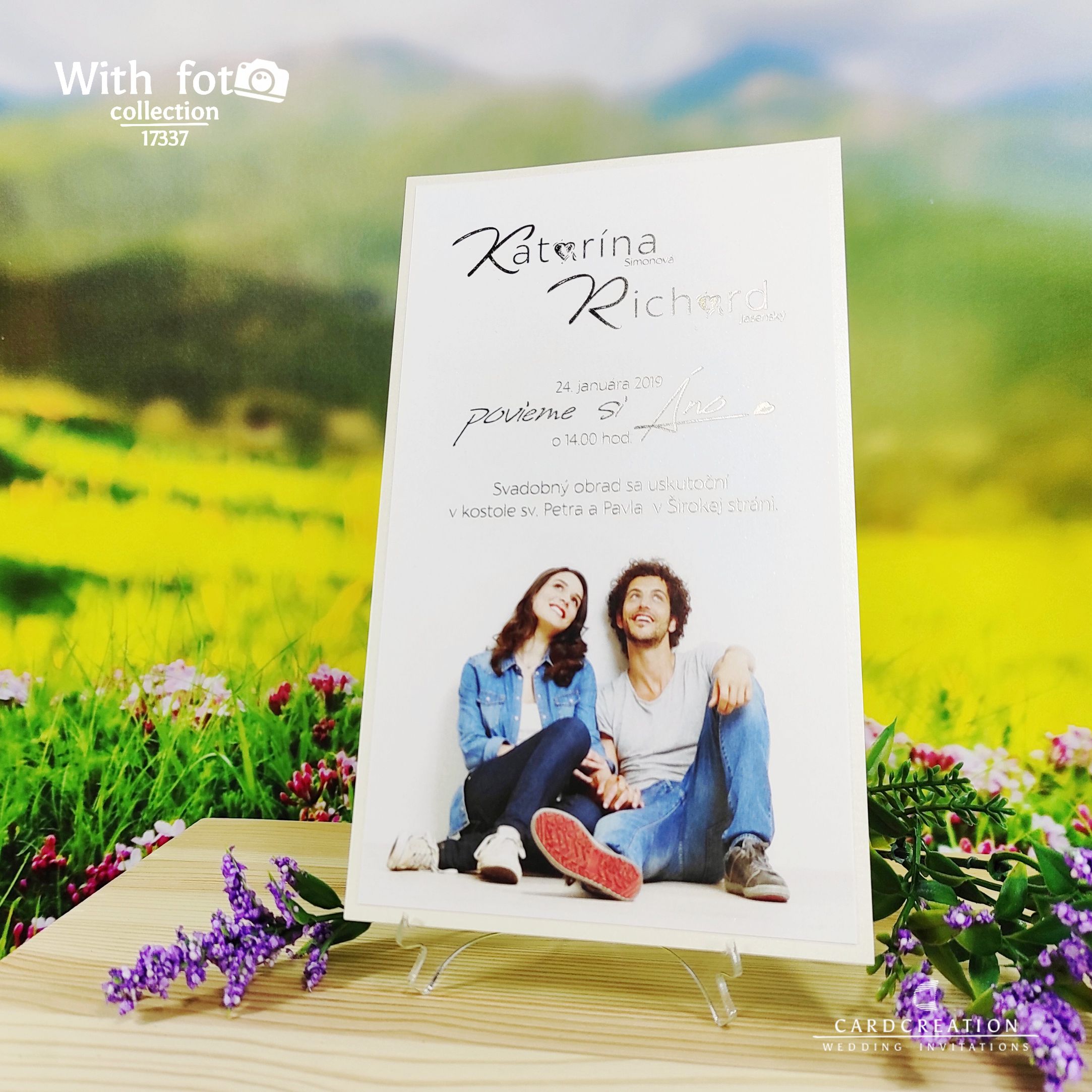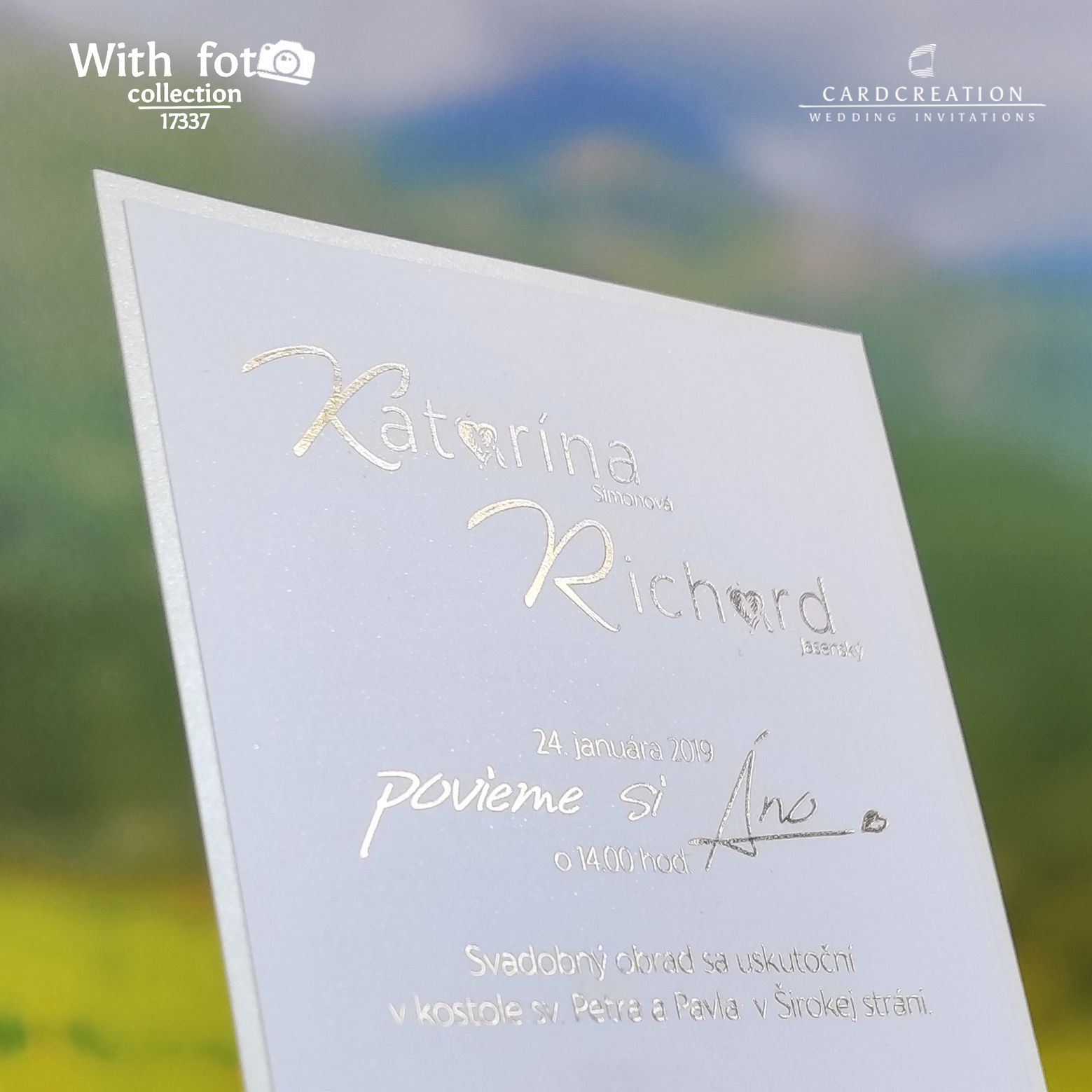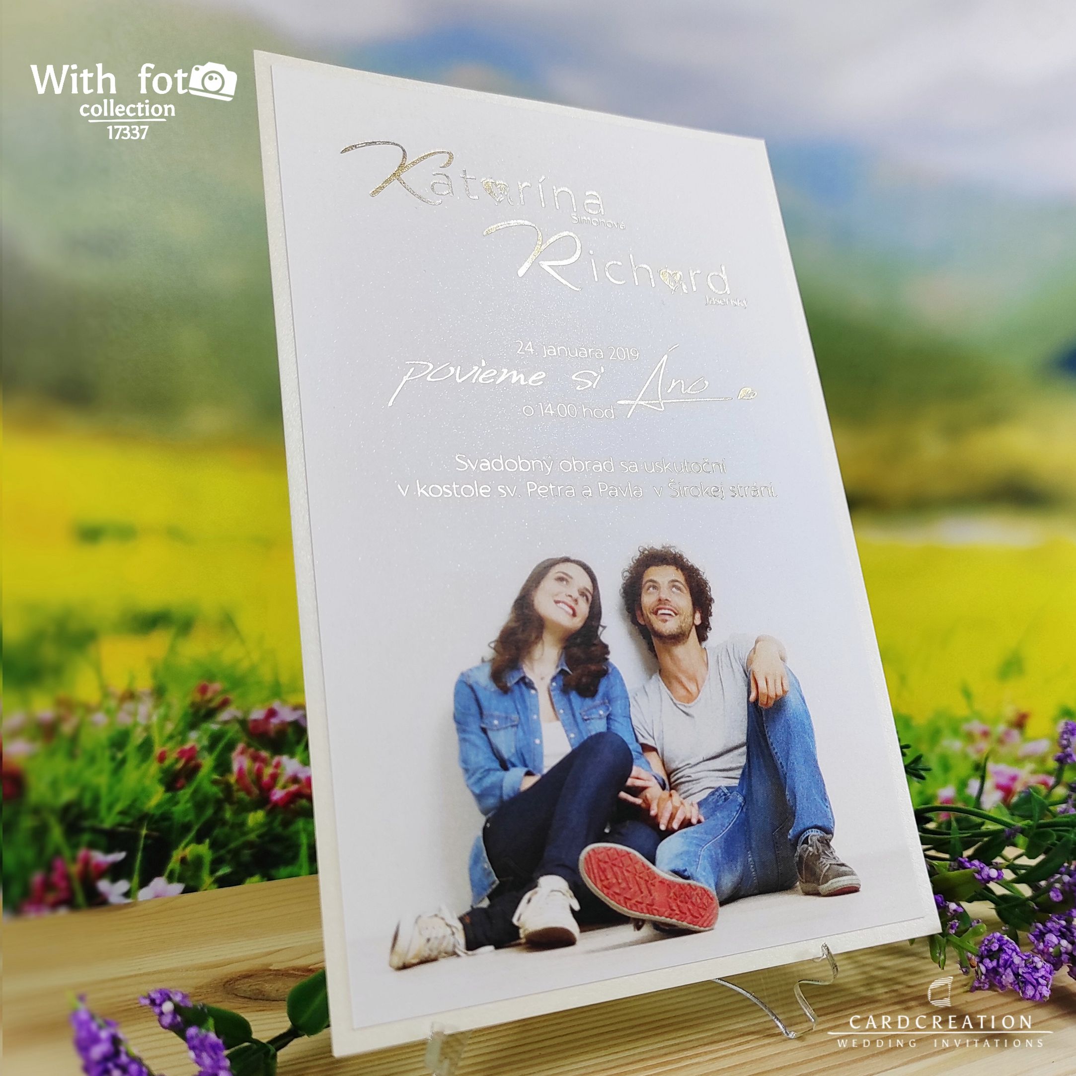 Moderné svadobné oznámenie s fotografiou mladomanželov na perleťovom bielom papieri. Tlač textov zlatou termoražbou . Luxusný nádych oznámeniu dodáva podlepenie krémovým metalickým papierom. K oznámeniu sa v tomto štýle vyrábajú aj ostatné tlačoviny na svadbu.