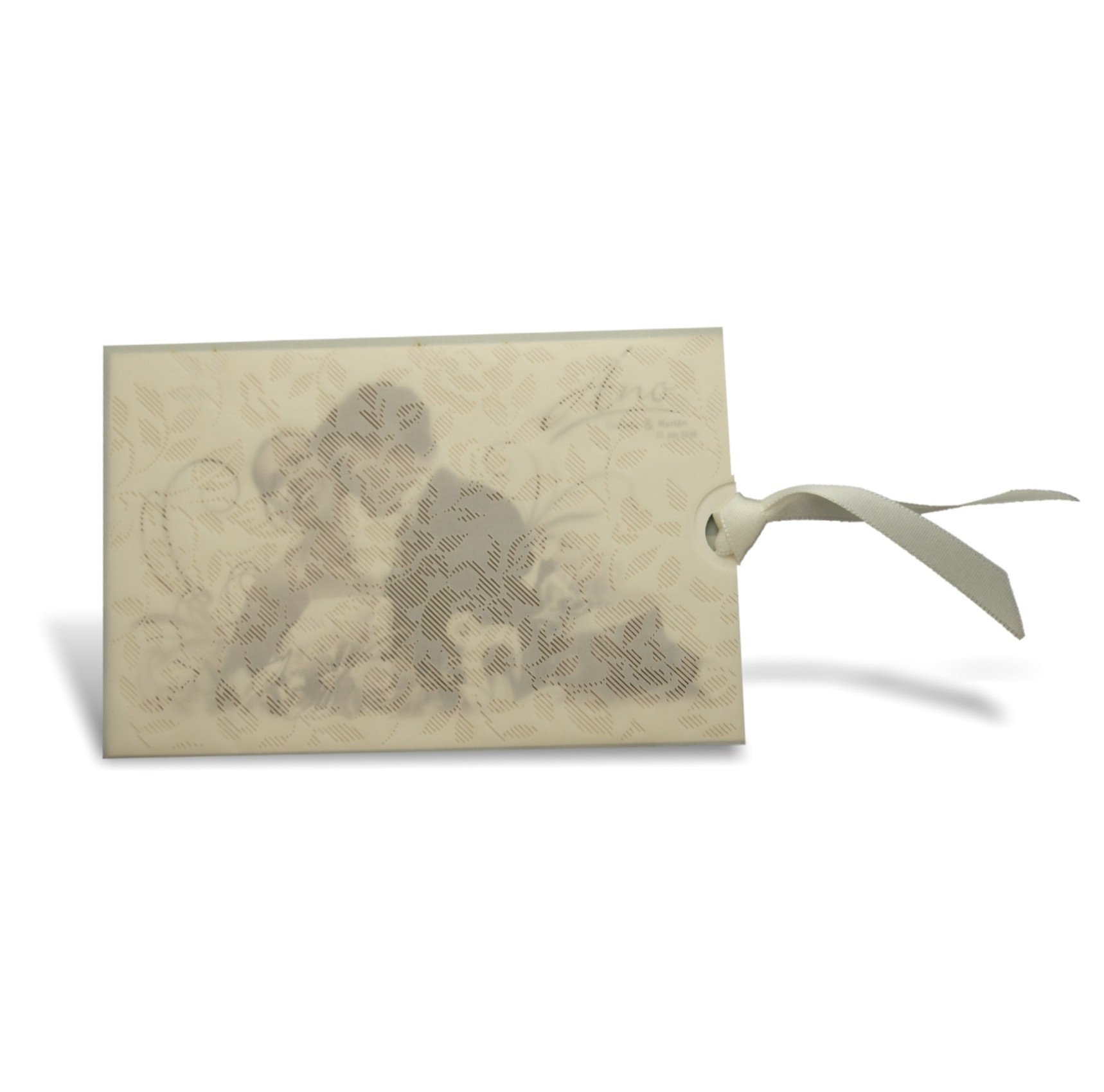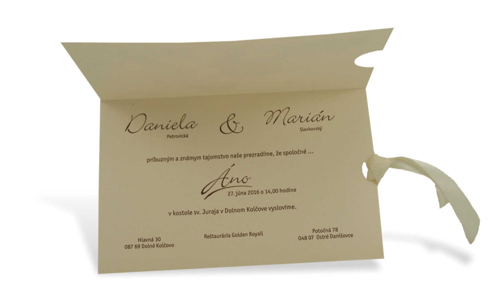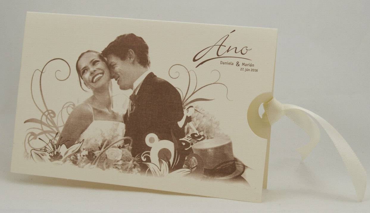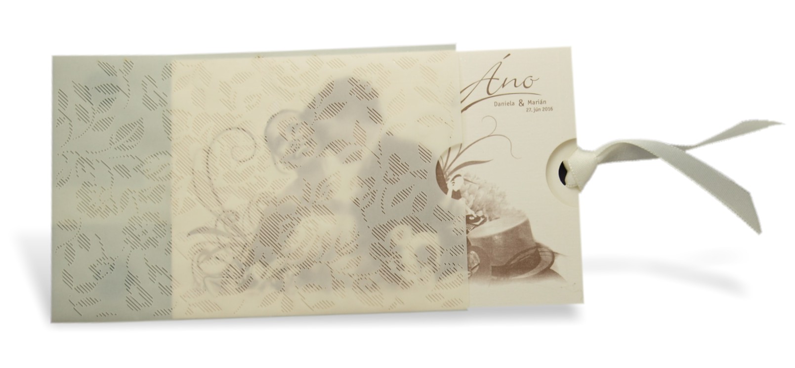 Otváracie svadobné oznámenie z prírodného krémového papiera s obojstrannou ražbou pripomínajúcou plátno s Vašou fotografiou. Obal oznámenia je z transparentného krémového papiera vyrezávaného laserom s tvarovým výsekom. K oznámeniu sa v tomto štýle vyrábajú aj ostatné tlačoviny na svadbu.