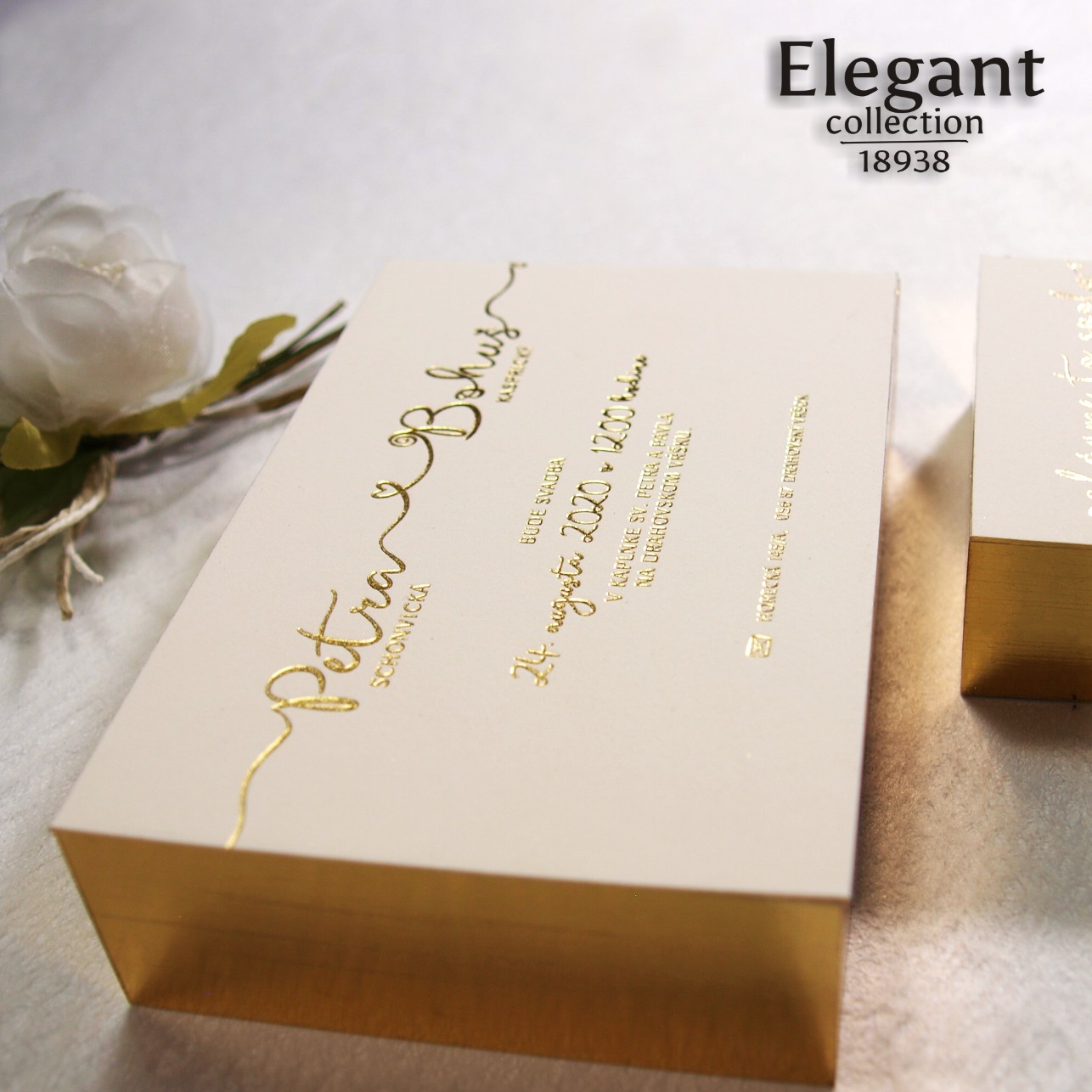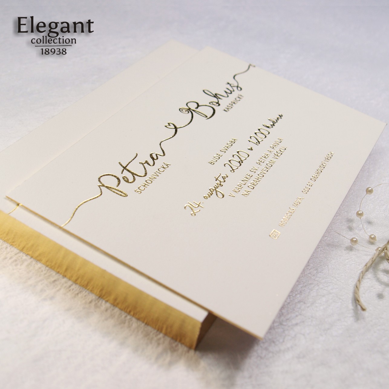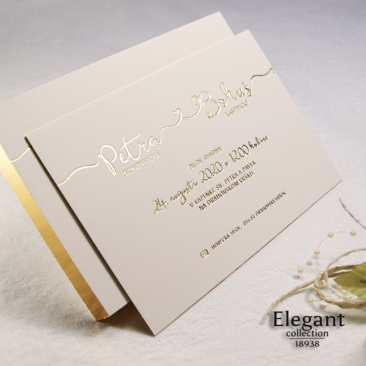 Moderné svadobné oznámenie vyrobené na veľmi hrubom grafickom kartóne. Texty sú razené zlatou fóliou. Hrany oznámenia sú zlatené – dodávajú oznámeniu luxusný vzhľad.