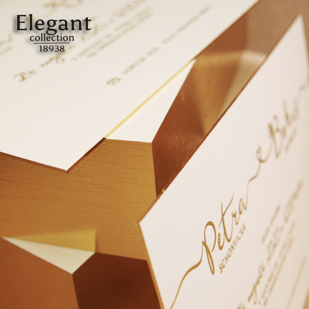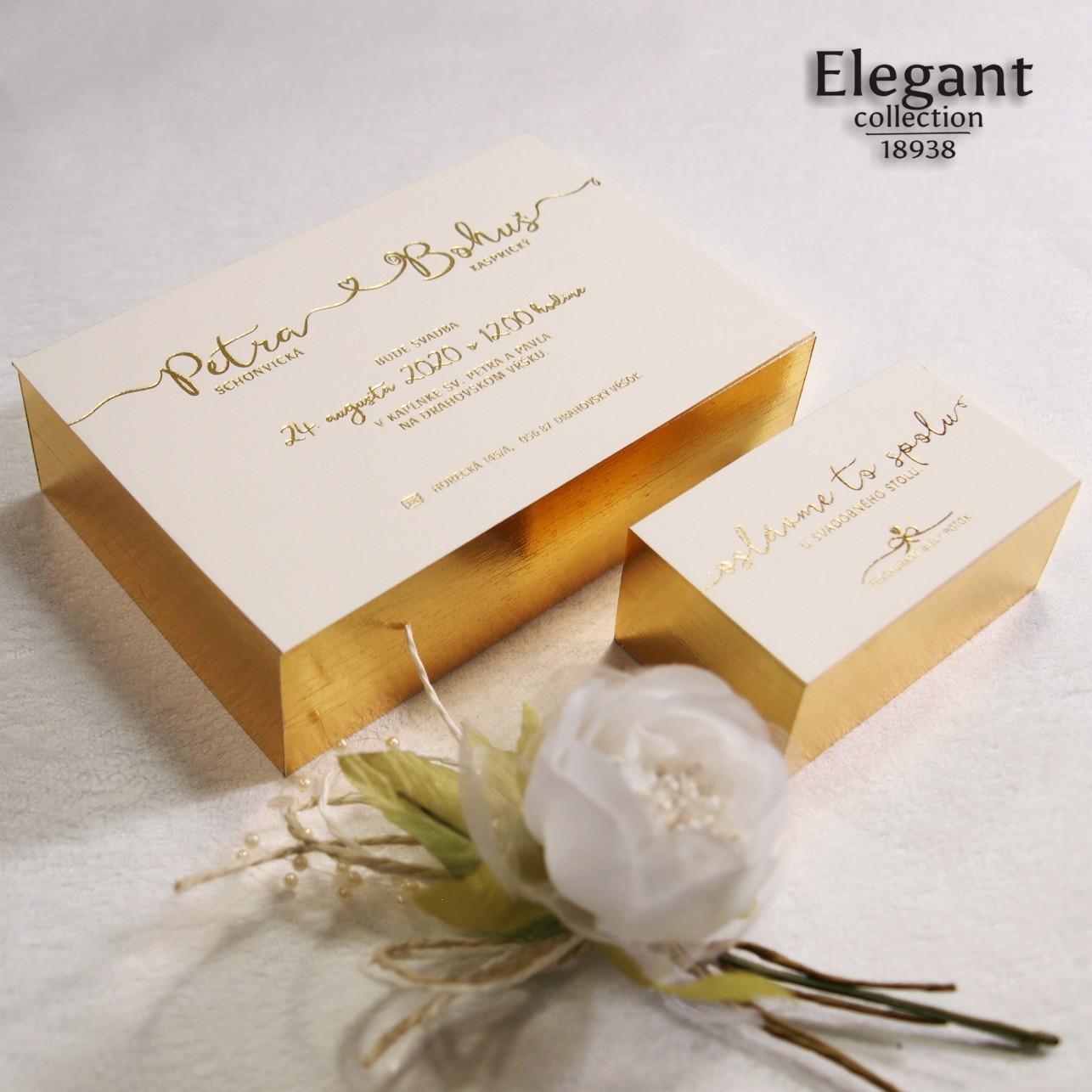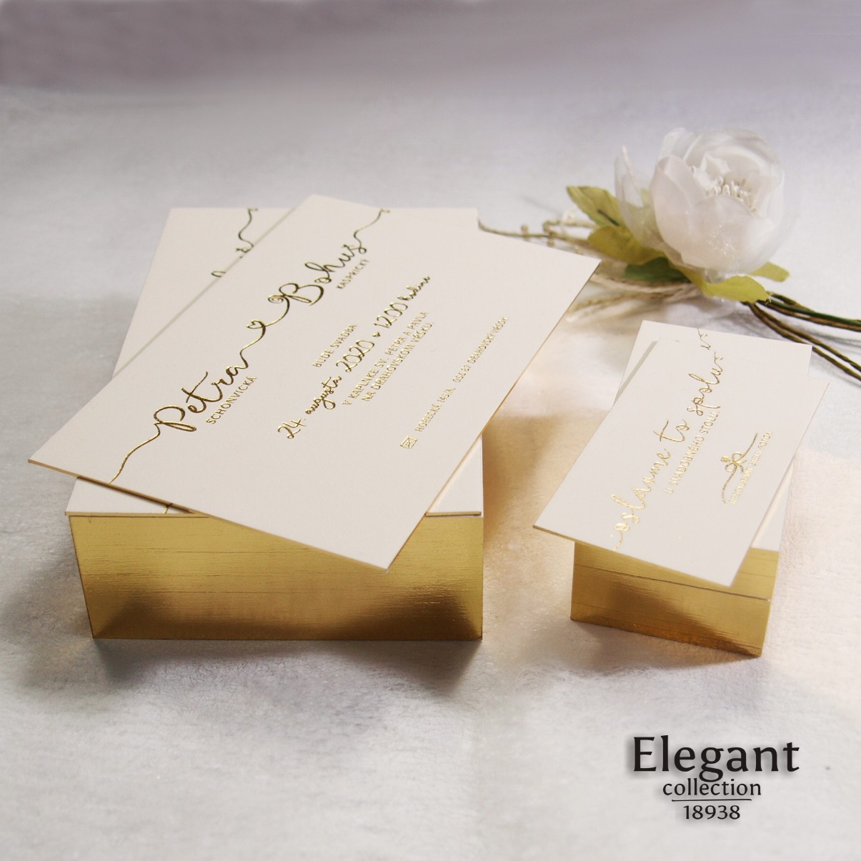 Moderné svadobné oznámenie vyrobené na veľmi hrubom grafickom kartóne. Texty sú razené zlatou fóliou. Hrany oznámenia sú zlatené – dodávajú oznámeniu luxusný vzhľad.
