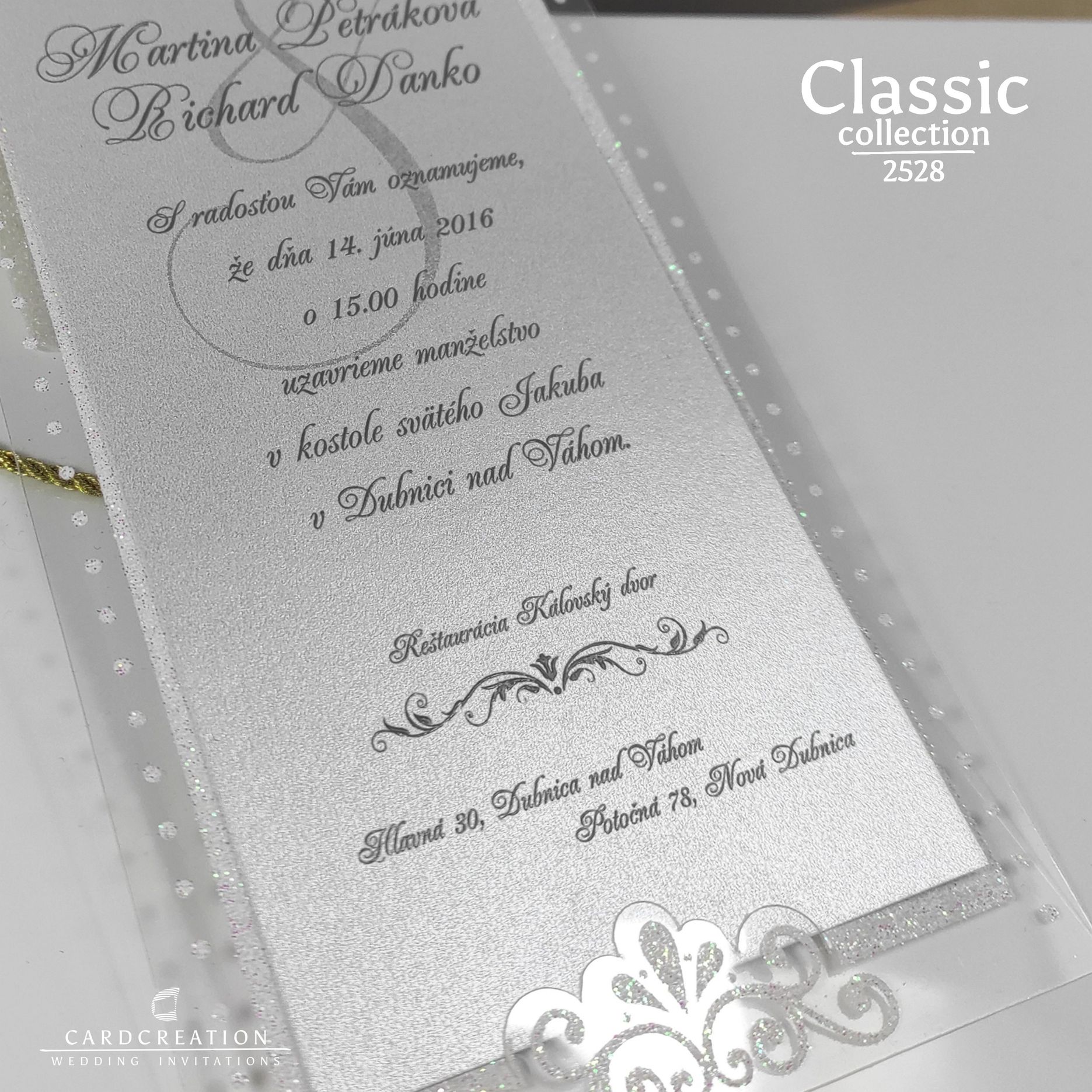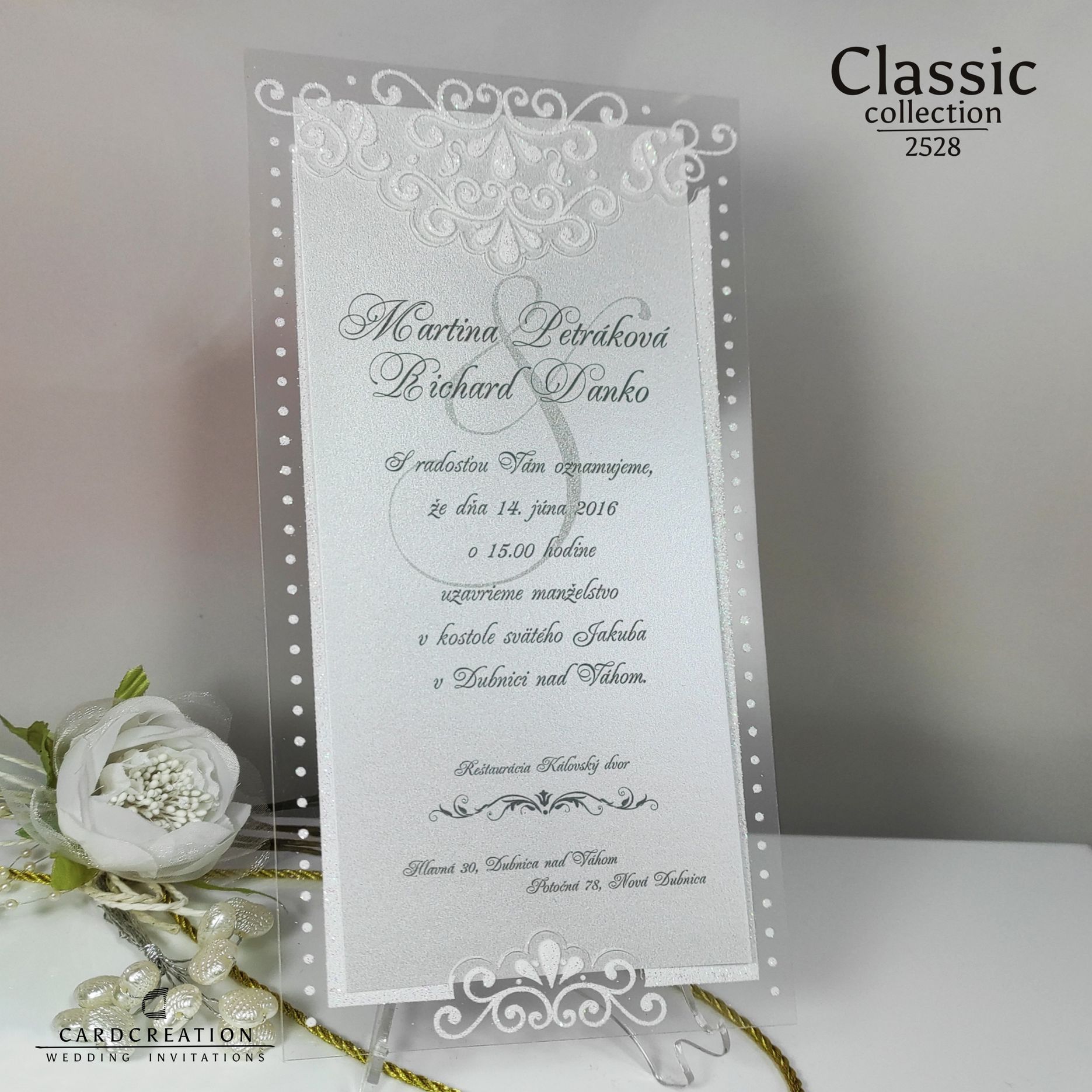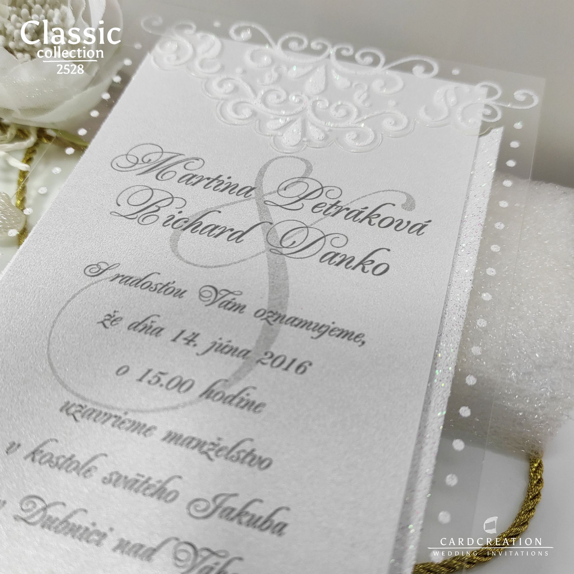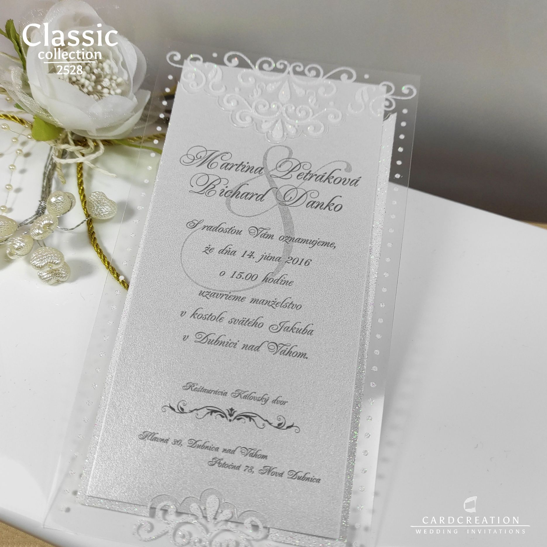 Svadobné oznámenie vyrobené z transparentnej priehľadnej fólie potlačenej bielou perleťou s glistrami. Texty sú tlačené sivou farbou na bielom prírodnom papieri