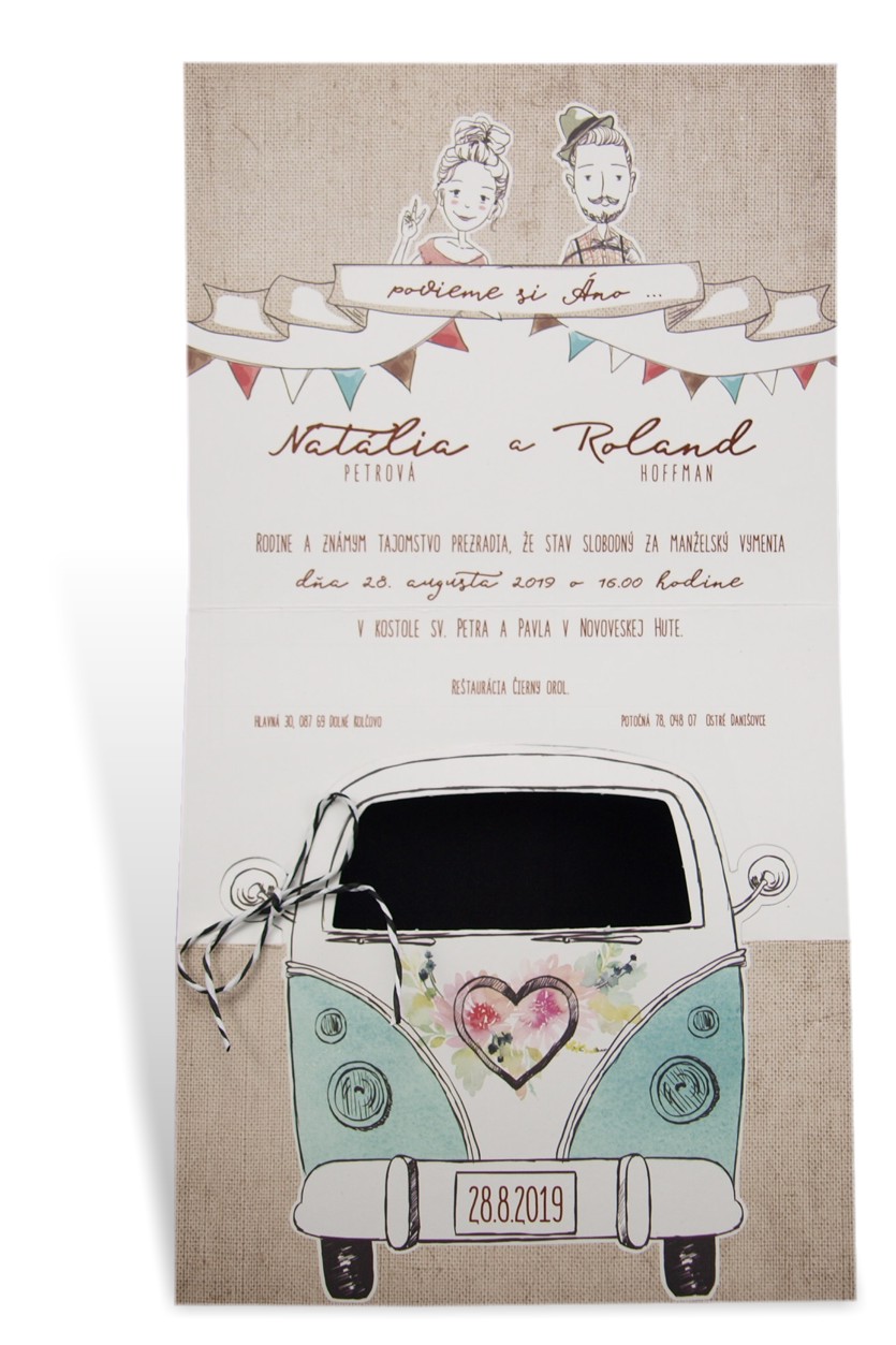 Humorné svadobné oznámenie s tvarovým výsekom. Oznámenie je natlačené efektnou termogravúrou.