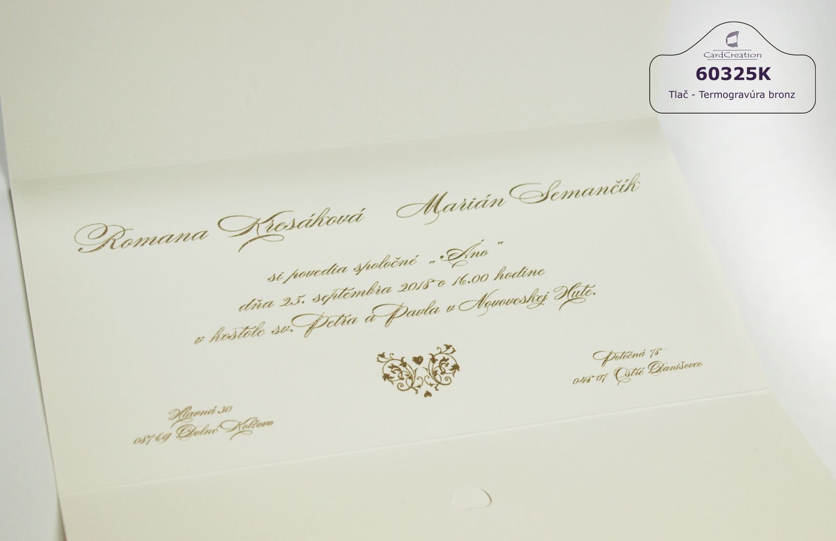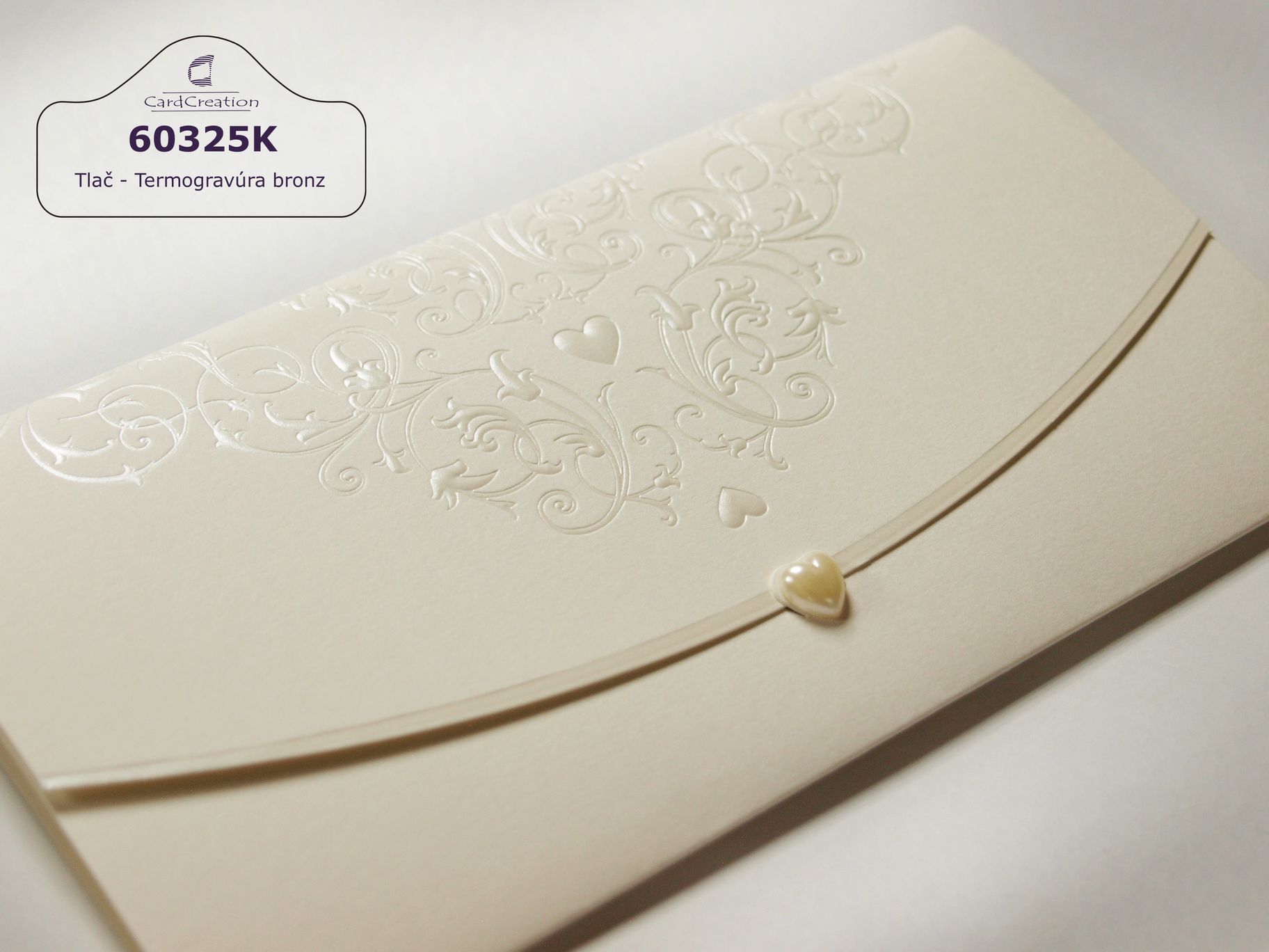 Otváracie oznámenie v jemnej krémovej farbe. 3D ražba ornamentov perleťovou fóliou. Zatváranie karty dozdobené srdiečkom perleťovej farby. Tlač textov efektnou termogravúrou.