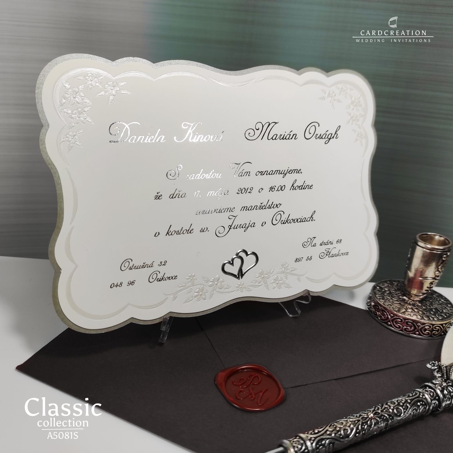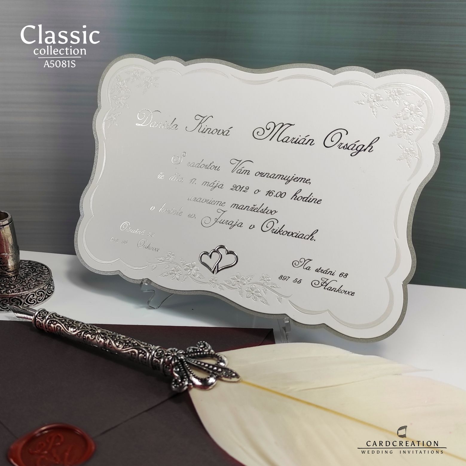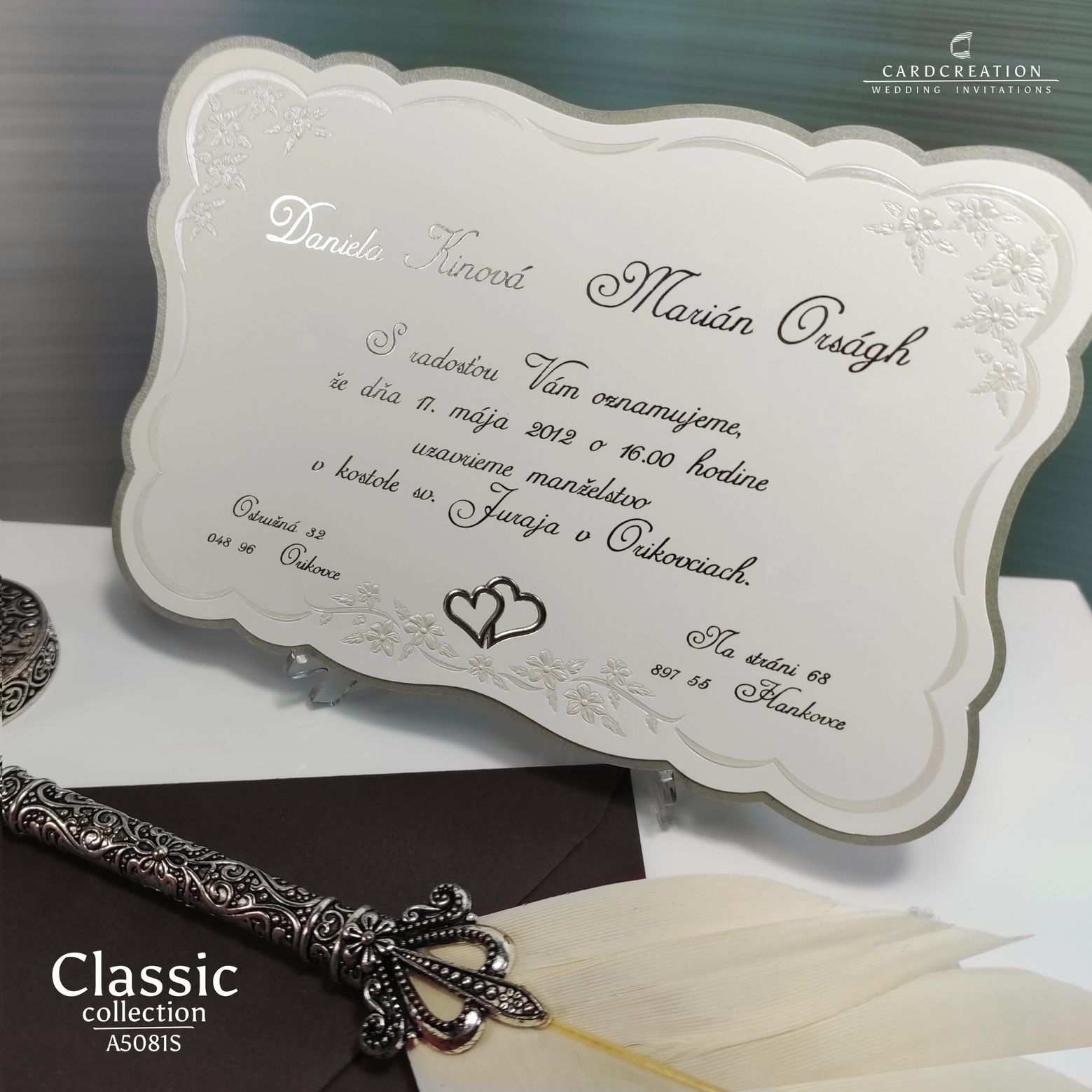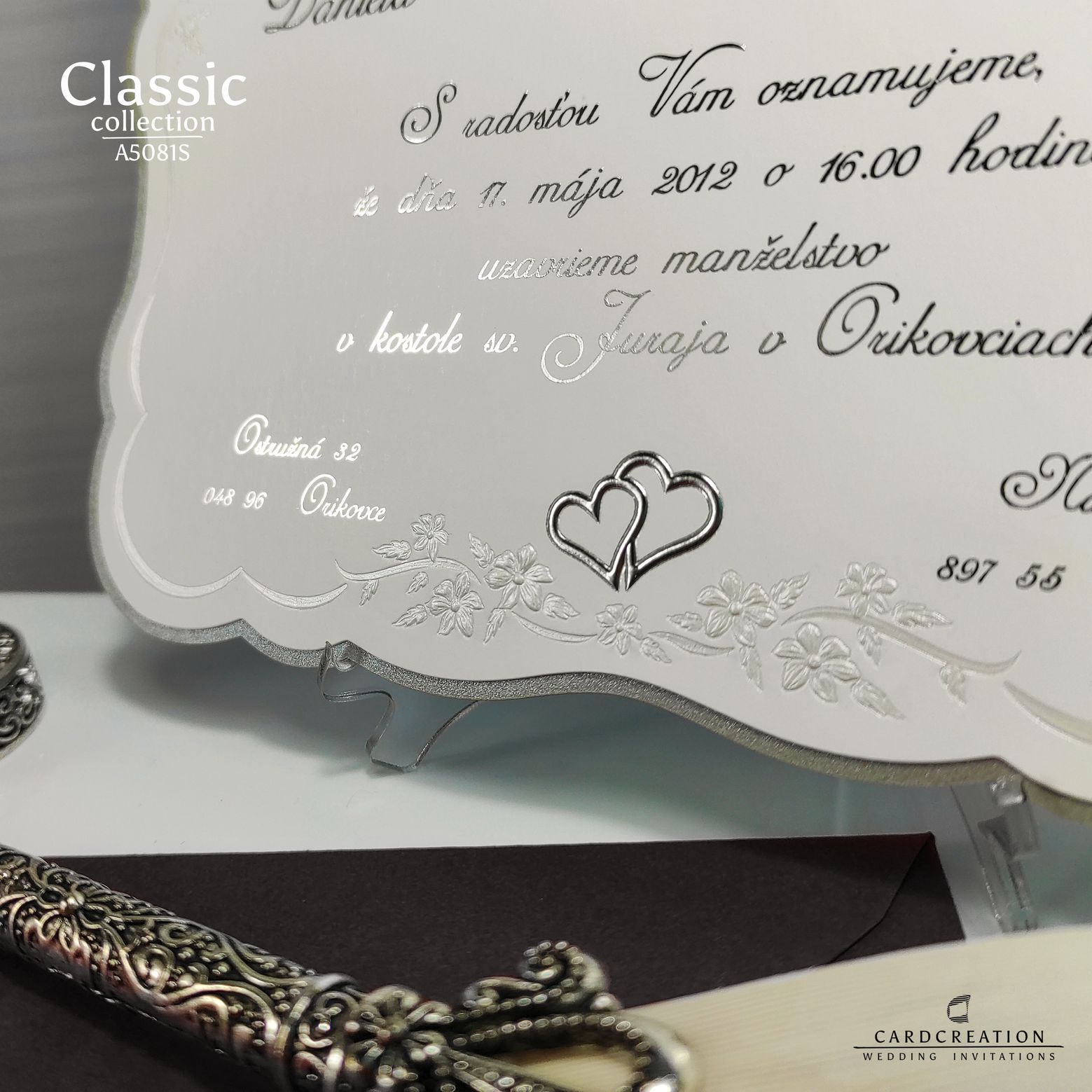 Svadobné oznámenia vyrobené v kombinácii strieborného metalického papiera a bieleho natieraného lesklého papiera s tvarovým výsekom a perleťovou a striebornou 3D ražbou. Text je natlačený striebornou termoražbou.