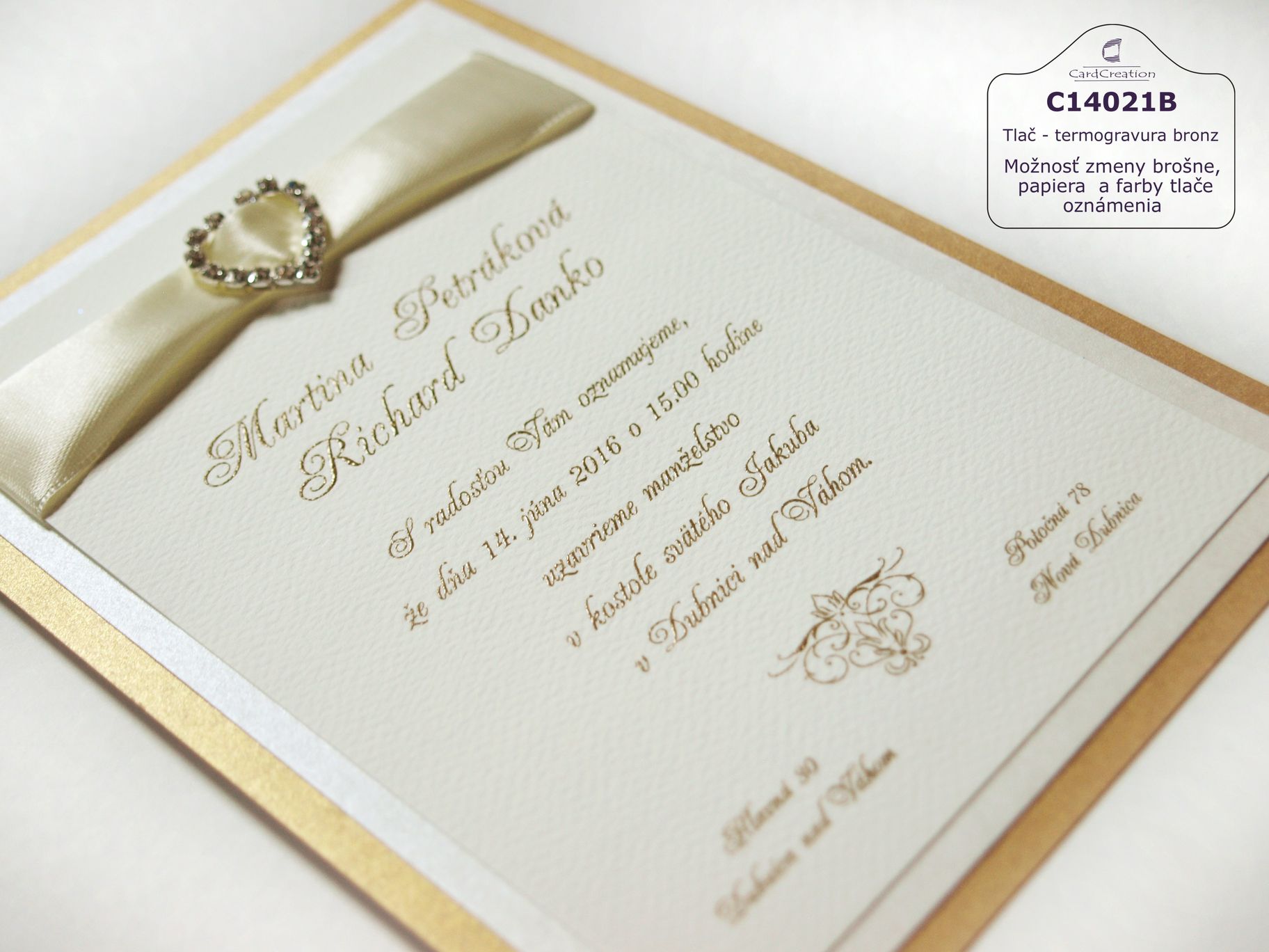 Svadobné oznámenie vyrobené z troch papierov (zlatý metalický, strieborný metalický, prírodného papier s ražbou) Oznámenie je ozdobené ozdobnou mašľou a brošňou v tvare srdiečka. U tohto typu oznámenia je možné kombinovať rôzne odtiene papierov, mašlí, brošní a samozrejme aj grafiky textov !!!