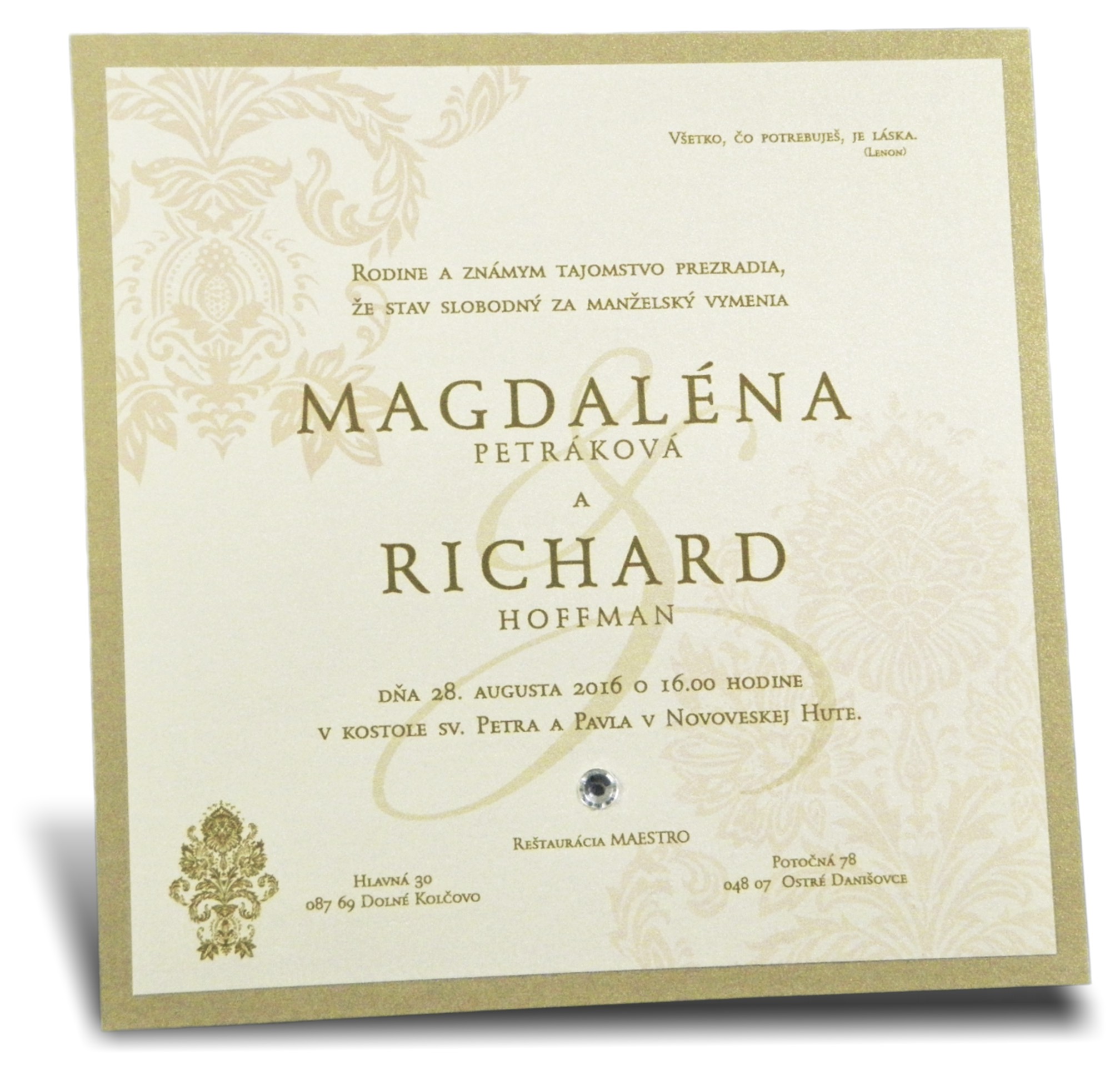 Svadobné oznámenie vyrobené z dvoch odtieňov papierov zlatistej metalickej farby. Oznámenie je ozdobené ozdobným kamienkom.