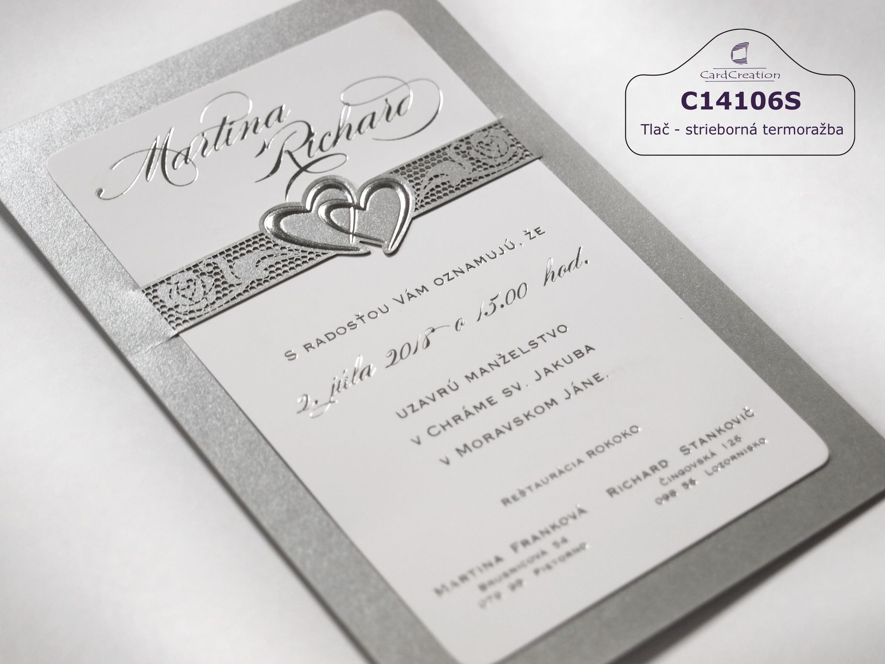 Obal oznámenia je z tmavšieho strieborného papiera ornament je vyrezávaný laserom + 3D ražba srdiečok striebornou termoražbou Vnútorná karta je vyrobená z bieleho papiera. Texty sú tlačené striebornou termoražbou.
