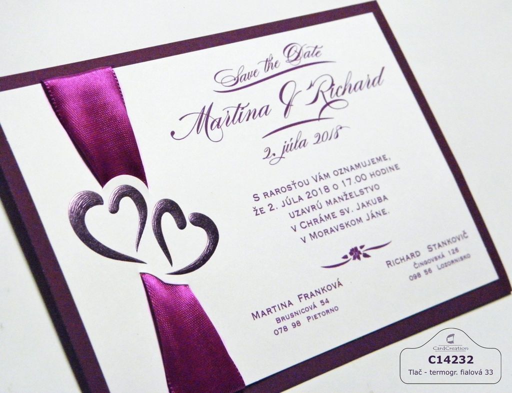Oznámenie v cyklamenovom prevedeni. Stuha aj 3D ražba srdiečok cyklamenovej farby. Oznámenie sa skladá z dvoch papierov. Spodný matný cyklamenovej farby na ňom je nalepený biely prírodný papier s jemnou perleťou. Texty tlačené cyklamenovou farbou..
