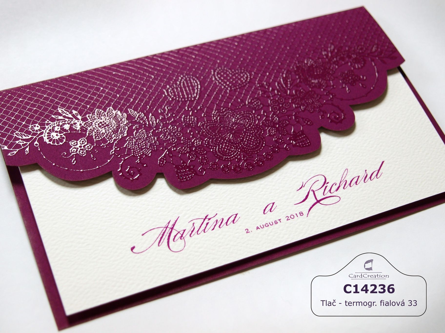 Oznámenie v cyklamenovom prevedeni. Obal oznámenia je vyrobený z matného cyklamenového papiera s potlačou. Ornament je vytlačený termogravúrou. Vnútorná otváracia karta je vyrobená z bieleho prírodného papiera s ražbou. Texty tlačené cyklamenovou farbou.