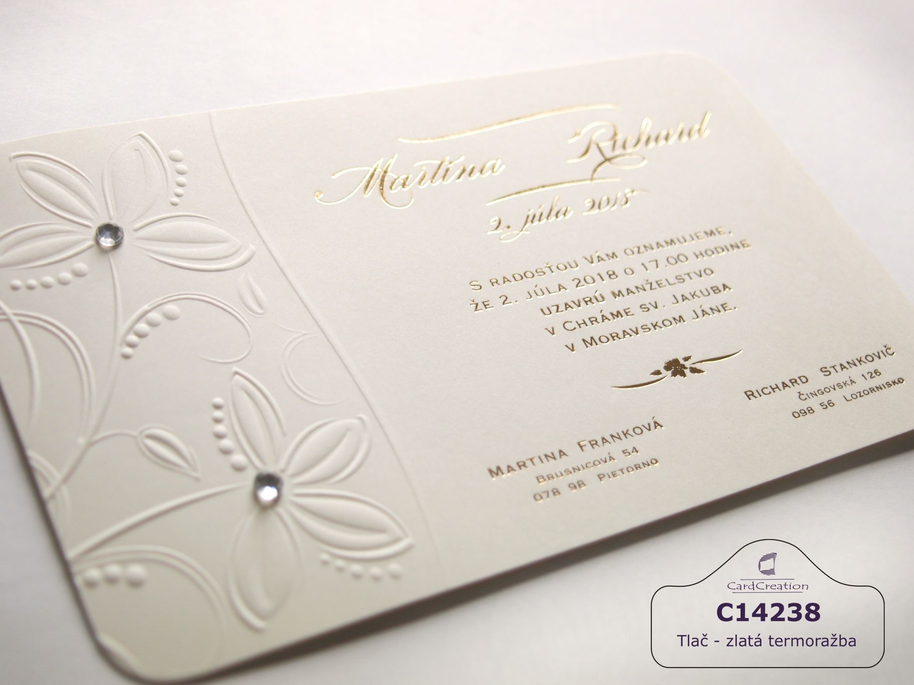 Oznámenie z prírodného krémového papiera s 3D ražbou kvietkov a ornamentov dozdobené ozdobnými kamienkami. Tlač textov zlatou termoražbou.