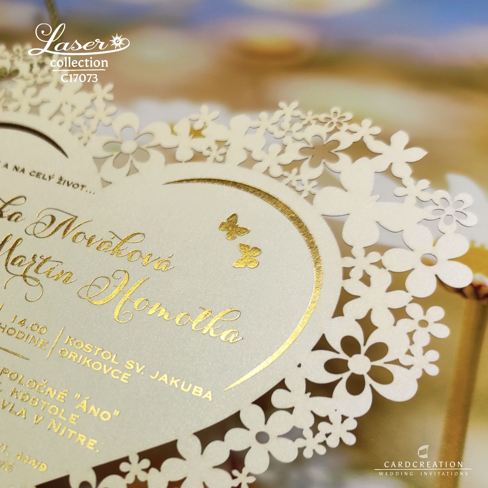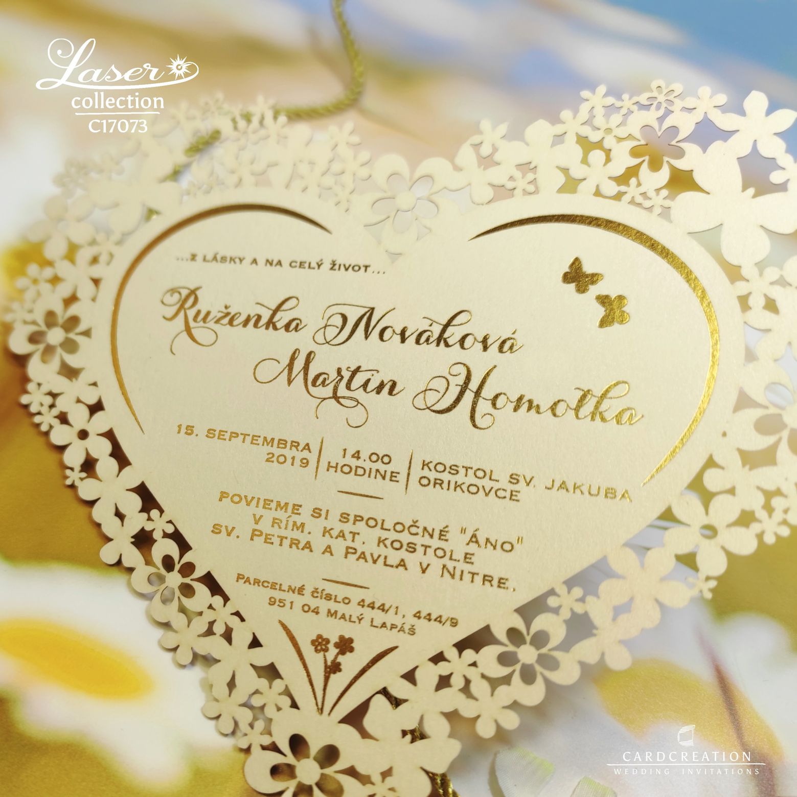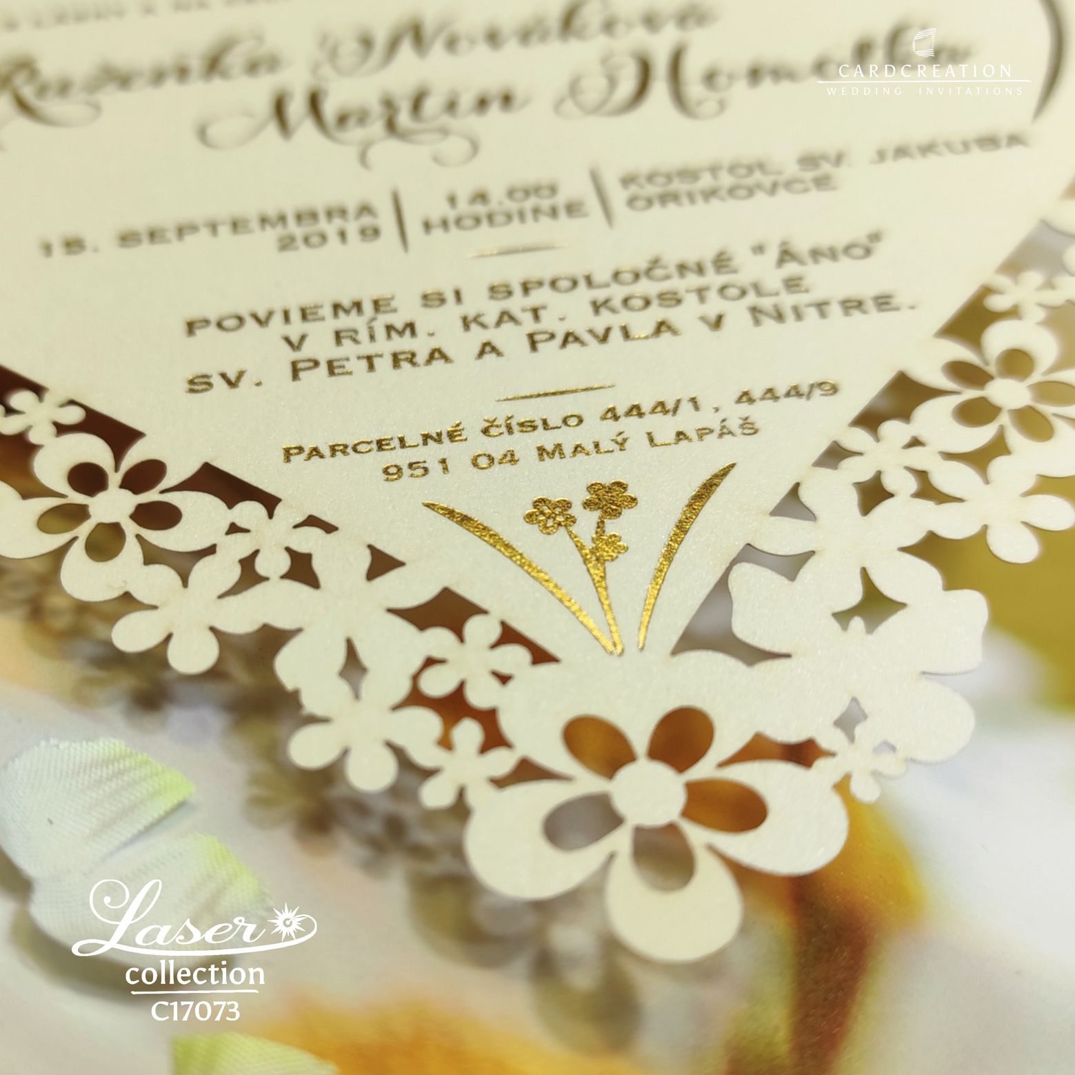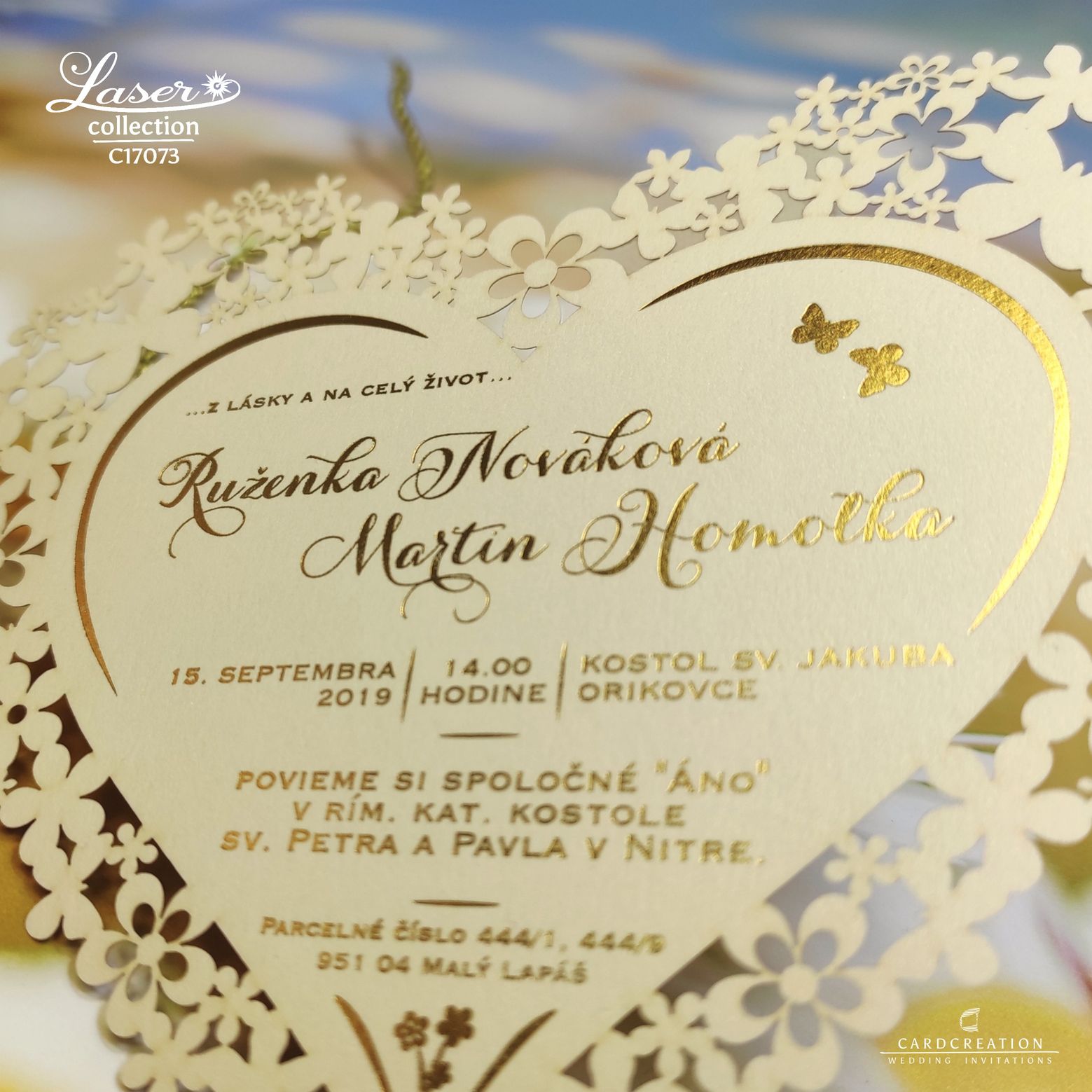 Oznámenia rezané laserom v tvare srdca. Tlač textov zlatou termoražbou. Laser dáva nové možnosti pri výrobe oznámení, hlavne tvarov aké sa v minulosti len ťažko dali vyrobiť. Zrealizujeme aj Vaše atypické nápady.