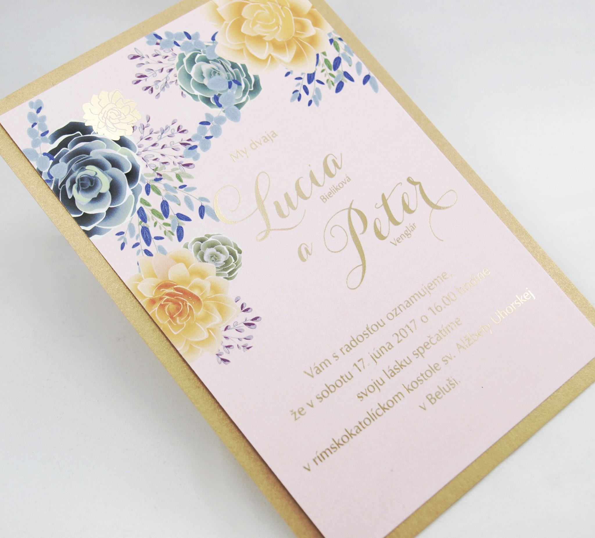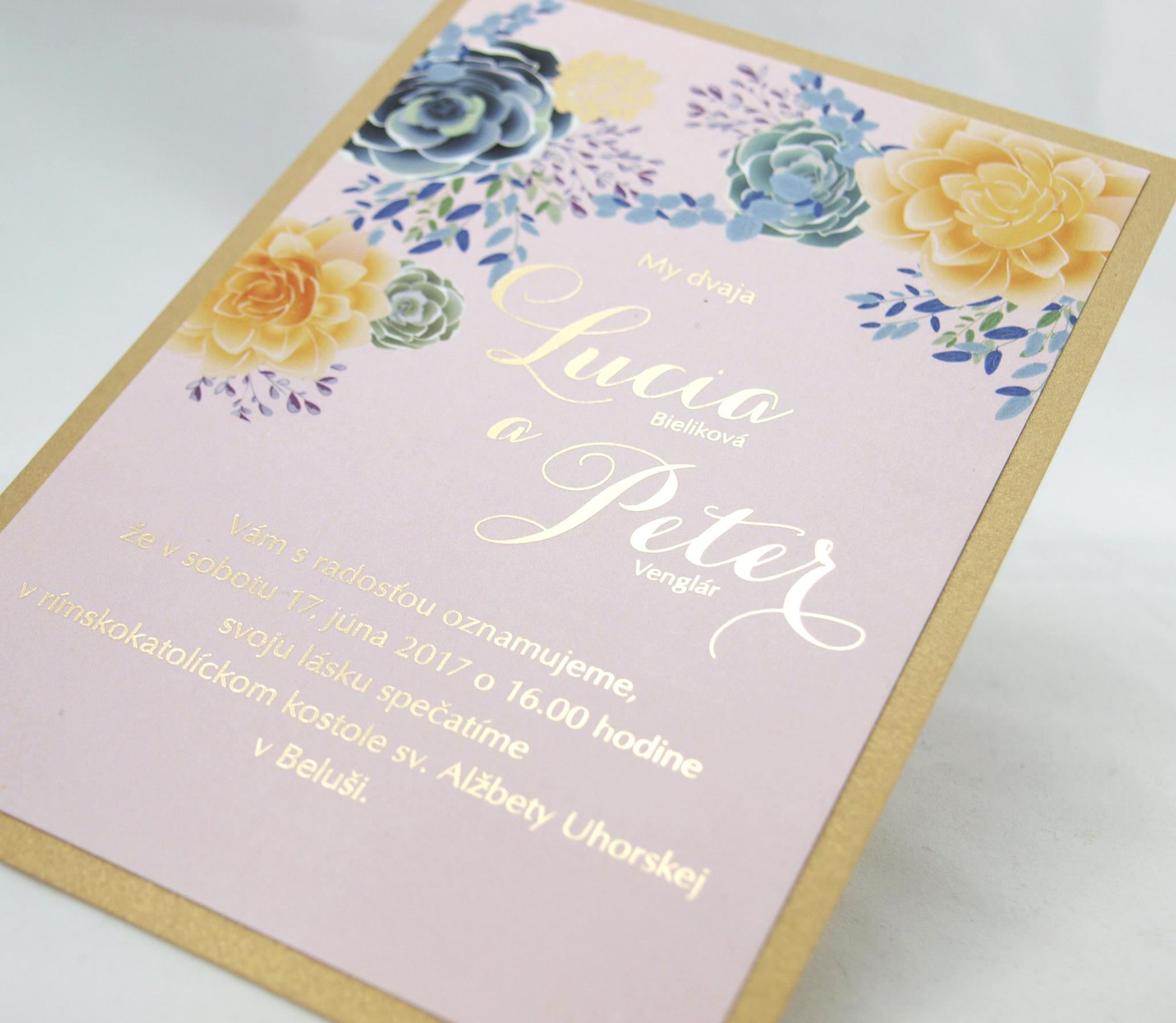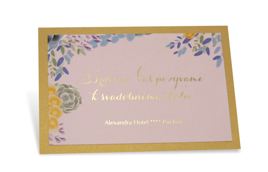 Krémový metalický zlatistý papier podlepený tmavším zlatistým metalickým papierom. Tlač textov zlatou termoražbou . K oznámeniu sa v tomto štýle vyrábajú aj ostatné tlačoviny na svadbu.