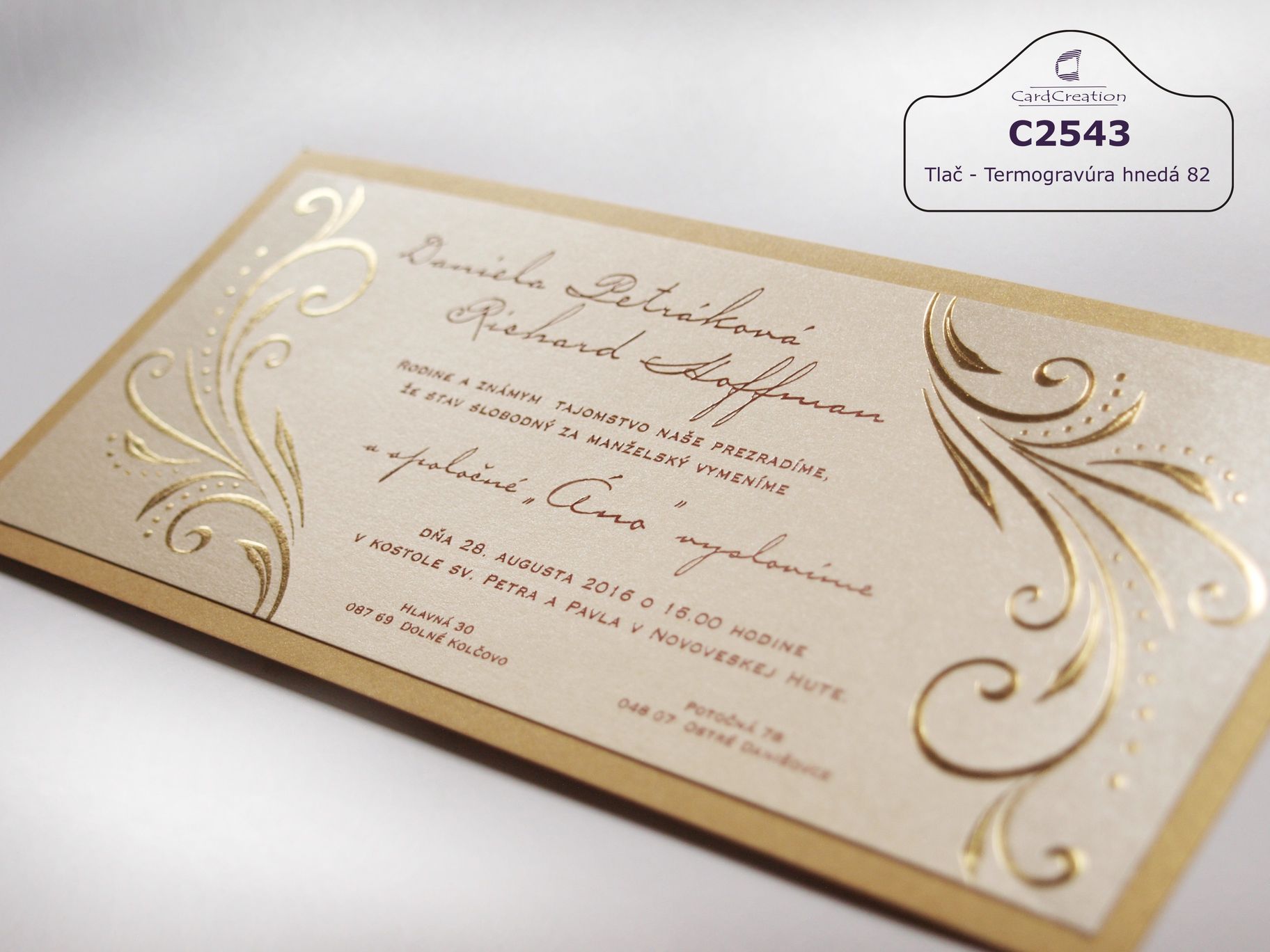 Svadobné oznámenie vyrobené v kombinácii dvoch metalických papierov zlatistej farby. Na svetlejšom papieri je 3D ražba zlatou termoražbou. Texty tlačené termogravúrou hnedou. Oznámenie je podlepené tmavšim odtieňom zlatej metalickej farby papiera