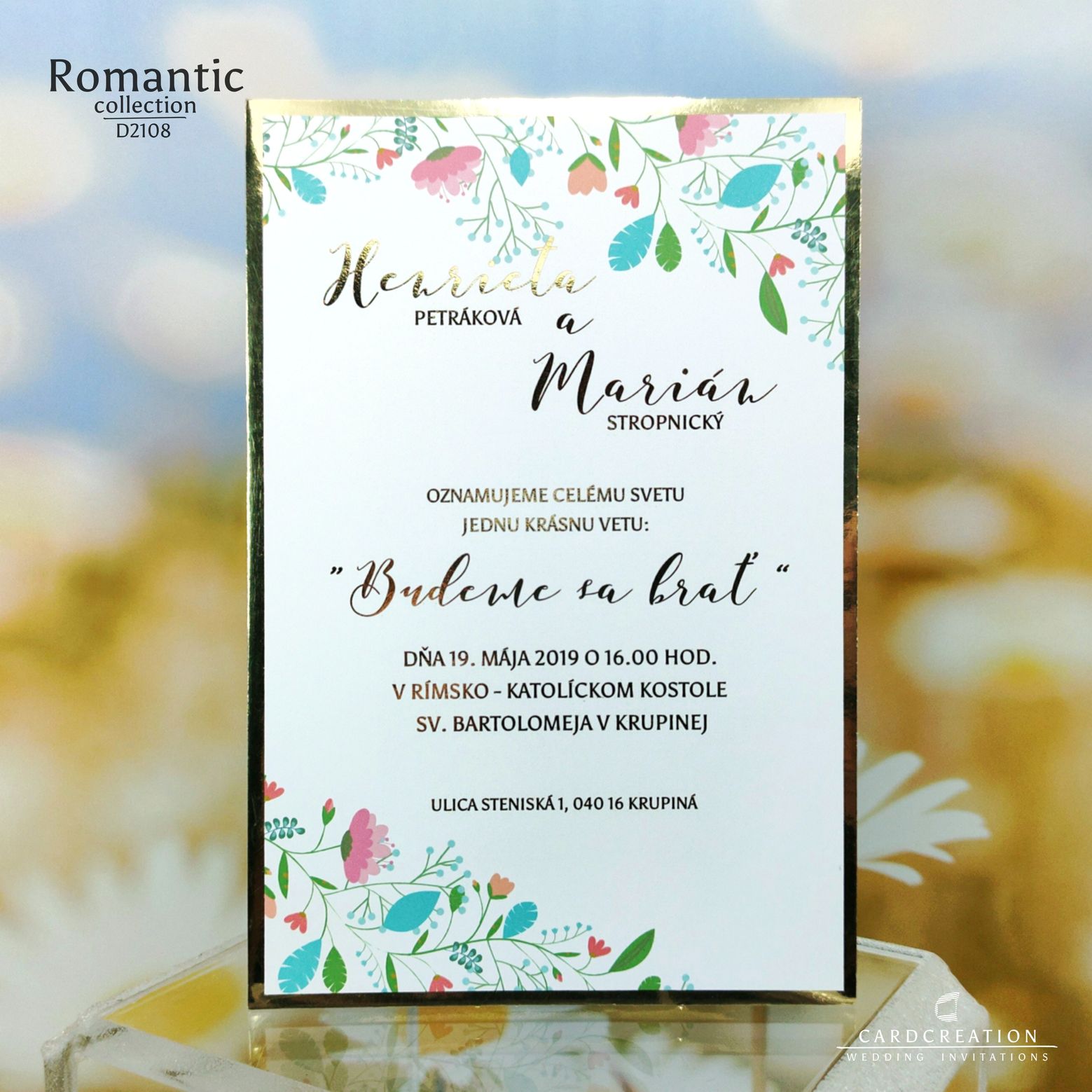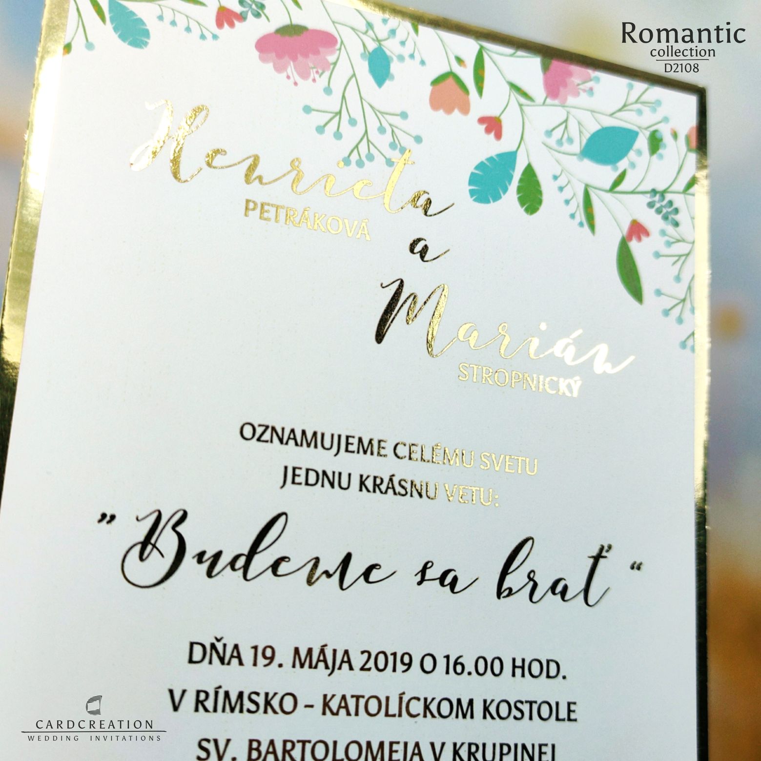 Moderné svadobné oznámenie D2108. Oznámenie je natlačené kombináciou digitálnej tlače a zlatej termoražby. Oznámenie sa skladá z dvoch zlepených kartičiek-spodný papier je zrkadlovo zlatý luxusný kartón. K oznámeniu sa v tomto štýle vyrábajú aj ostatné tlačoviny na svadbu.