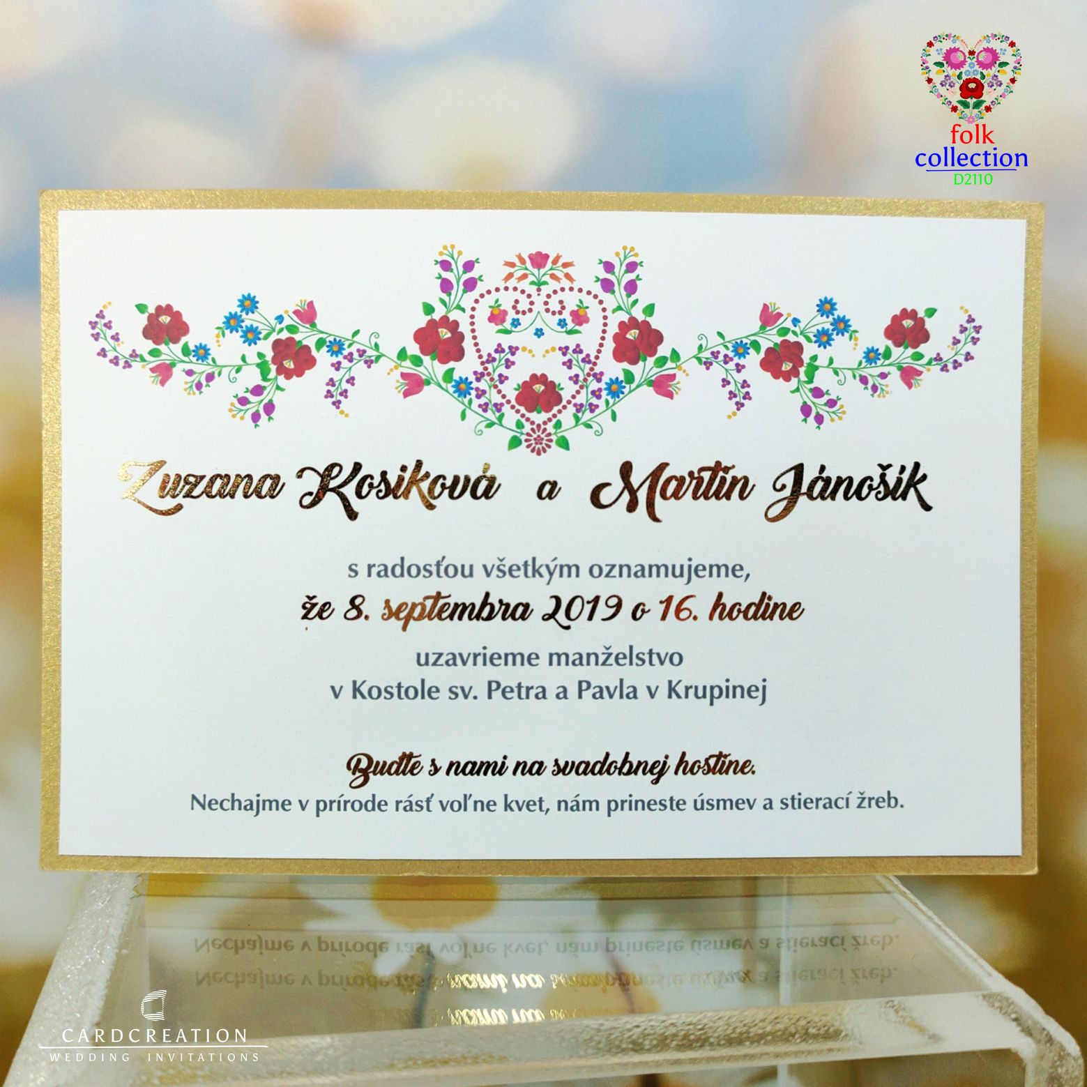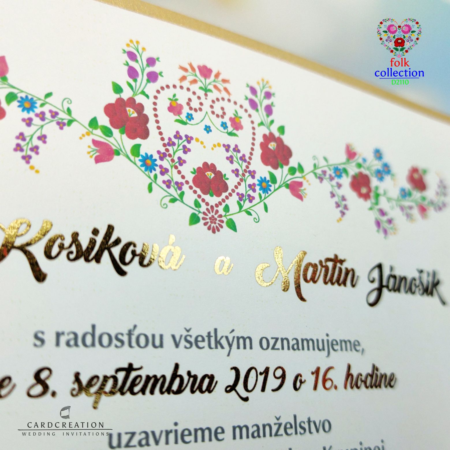 Romantické svadobné oznámenie D2110 je vyrobené z dvoch papierov-bieleho a zlatého metalického. Oznámenie je natlačené kombináciou digitálnej tlače a zlatej termoražby. K oznámeniu sa v tomto štýle vyrábajú aj ostatné tlačoviny na svadbu.