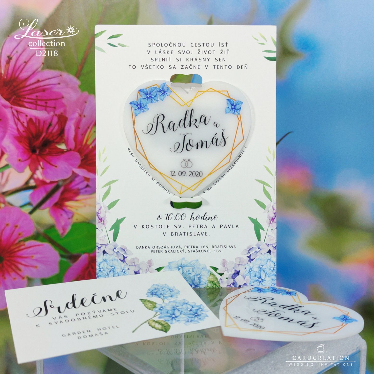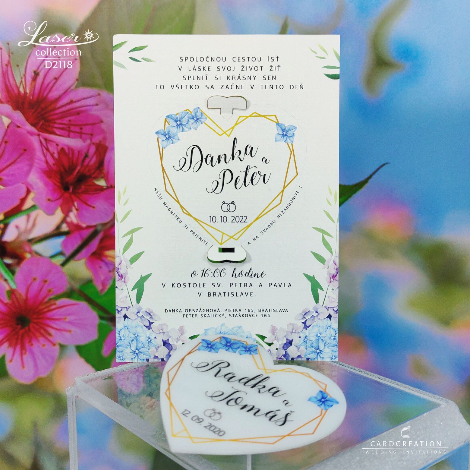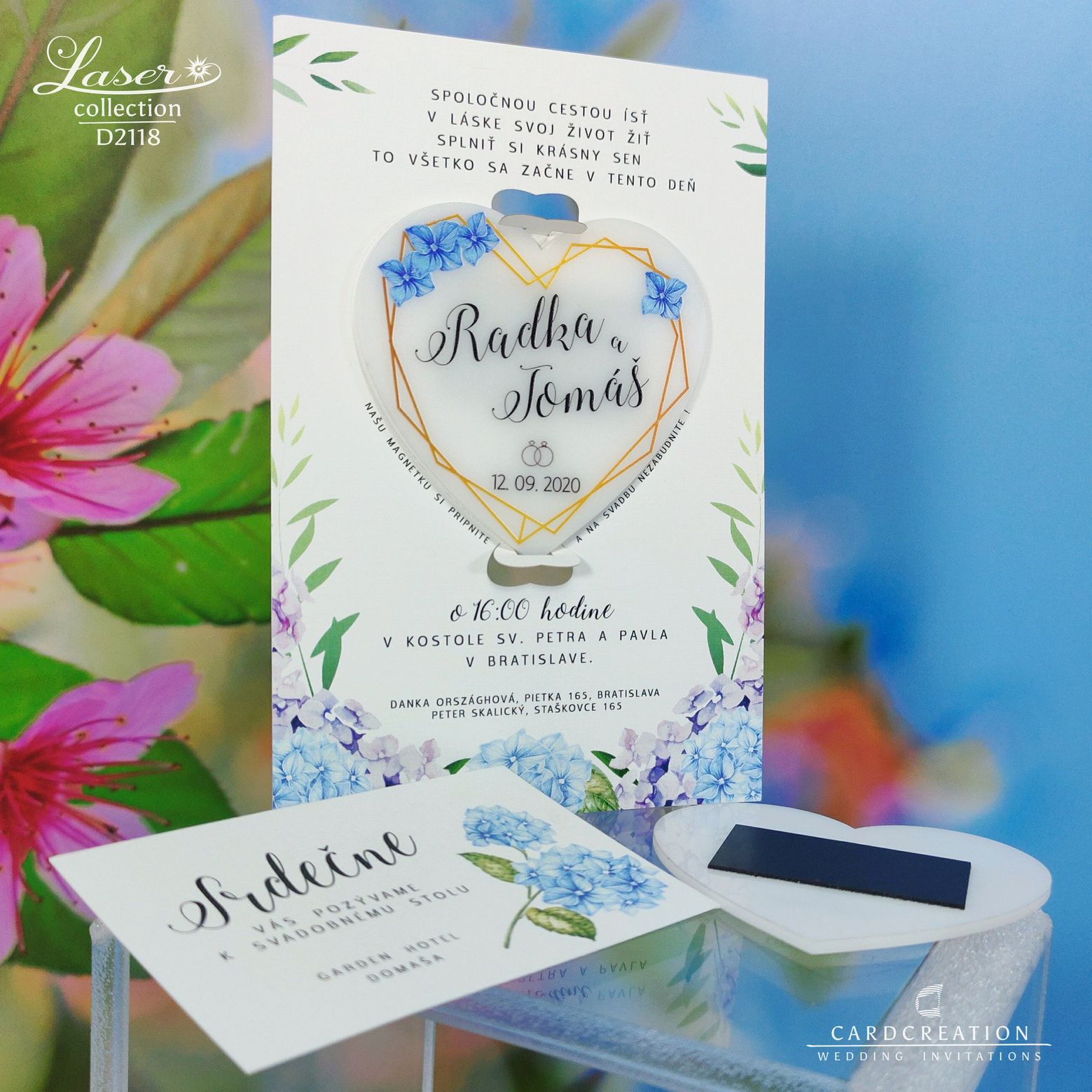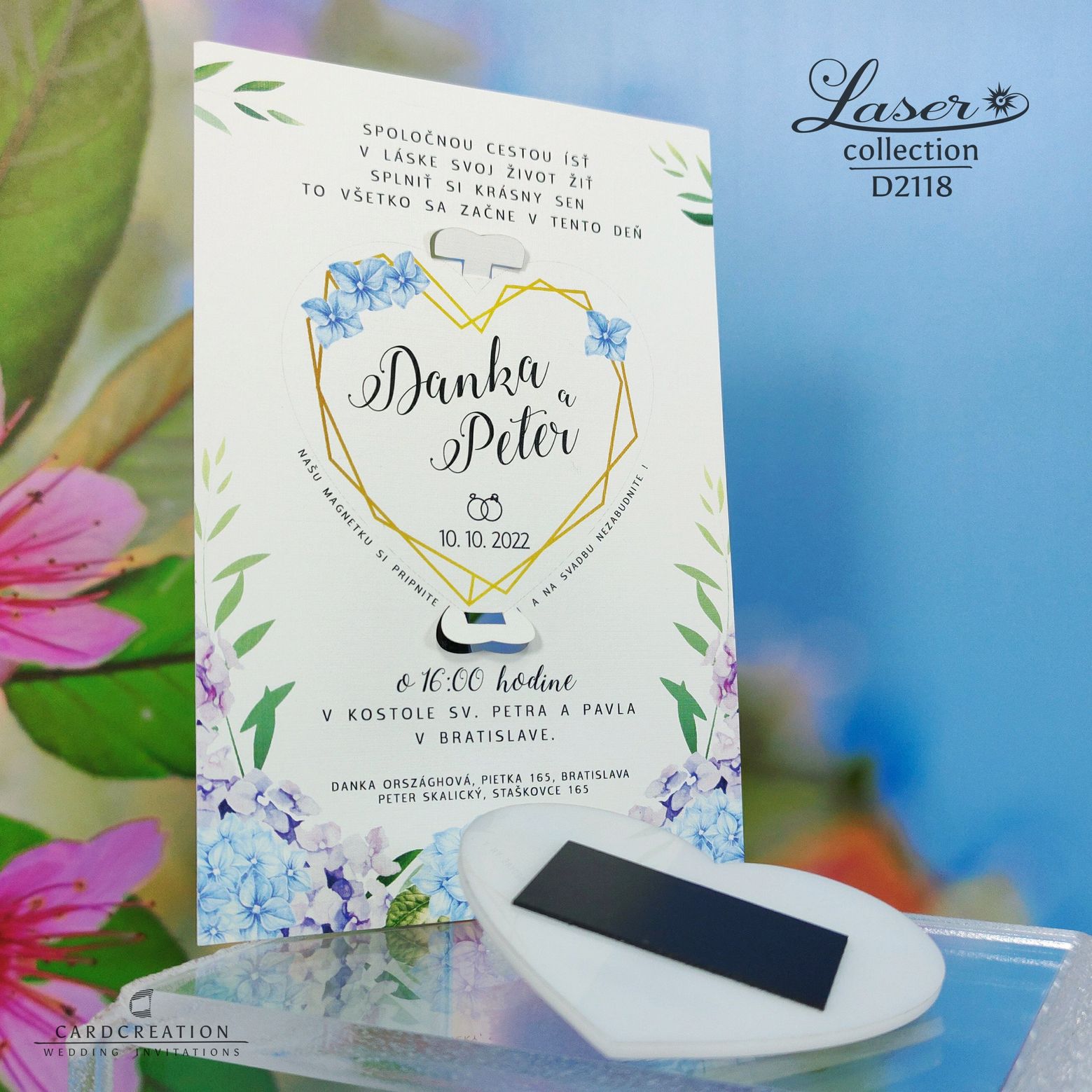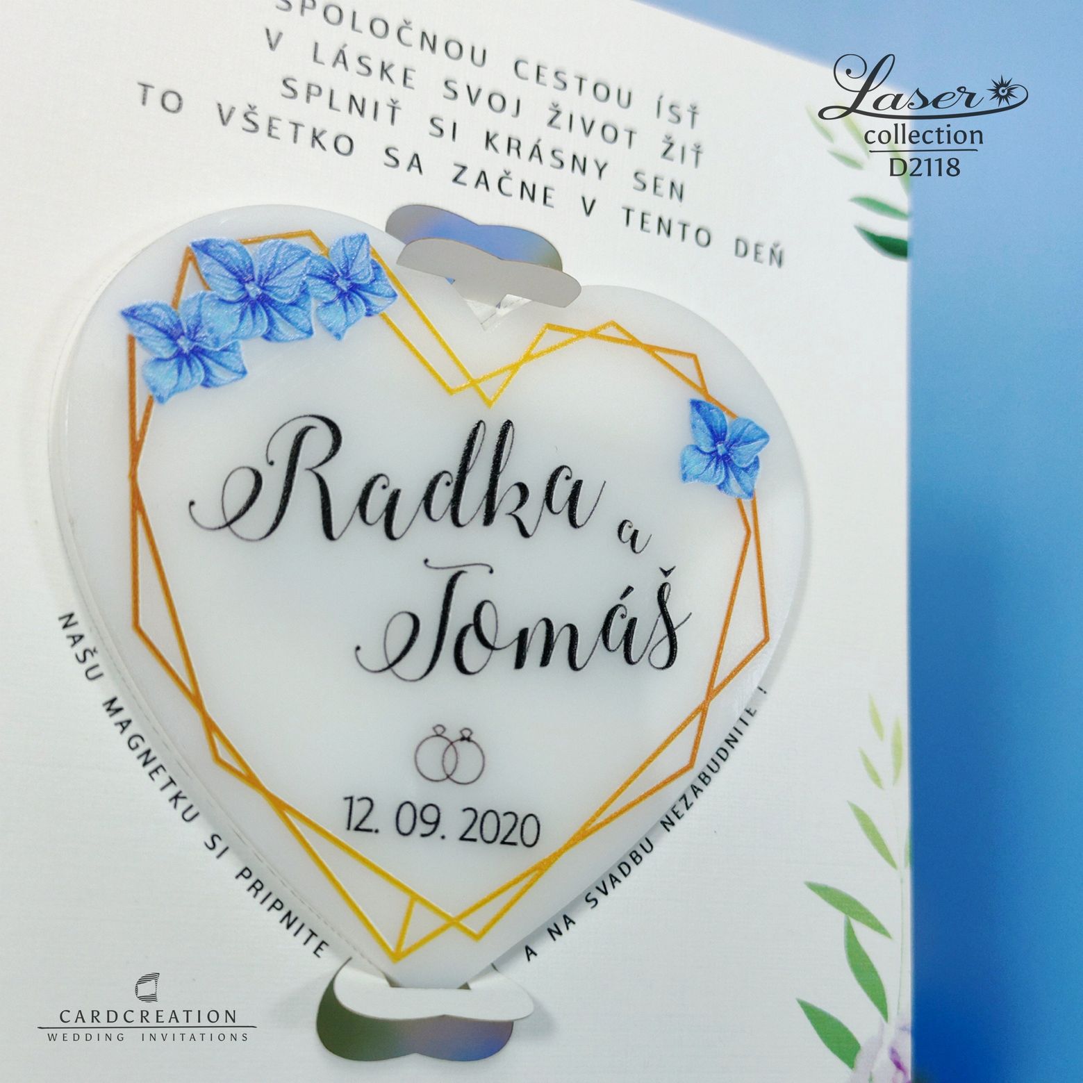 Moderné svadobné oznámenie s magnetkou D2118. Svadobné oznámenie je vytlačené na bielom papieri plnofarebnou tlačou. Plastová magnetka je potlačená bielou plnofarebnou tlačou. Magnetka je v oznámení vložená v západkách – jednoduché vybratie z oznámenia. K oznámeniu sa v tomto štýle vyrábajú aj ostatné tlačoviny na svadbu.