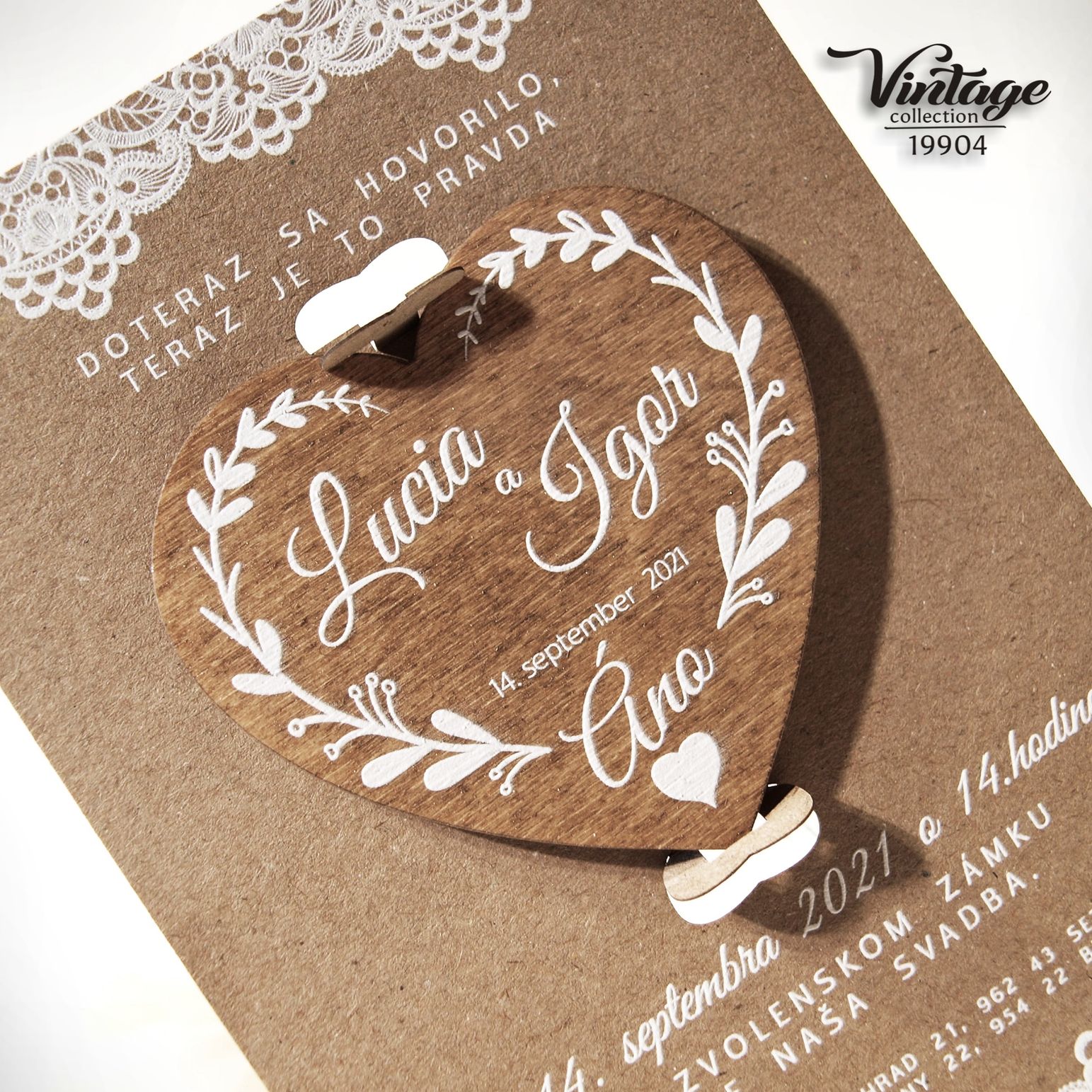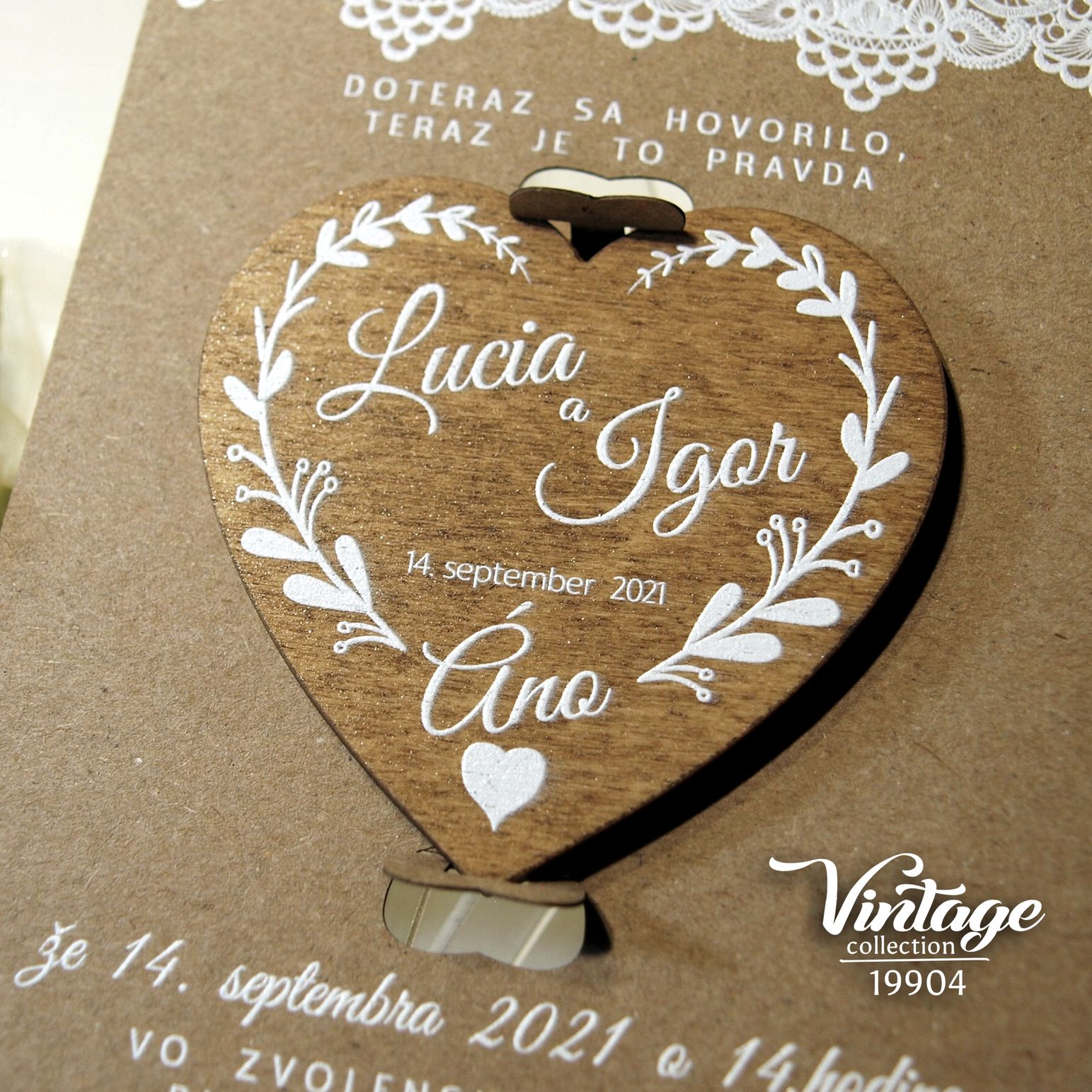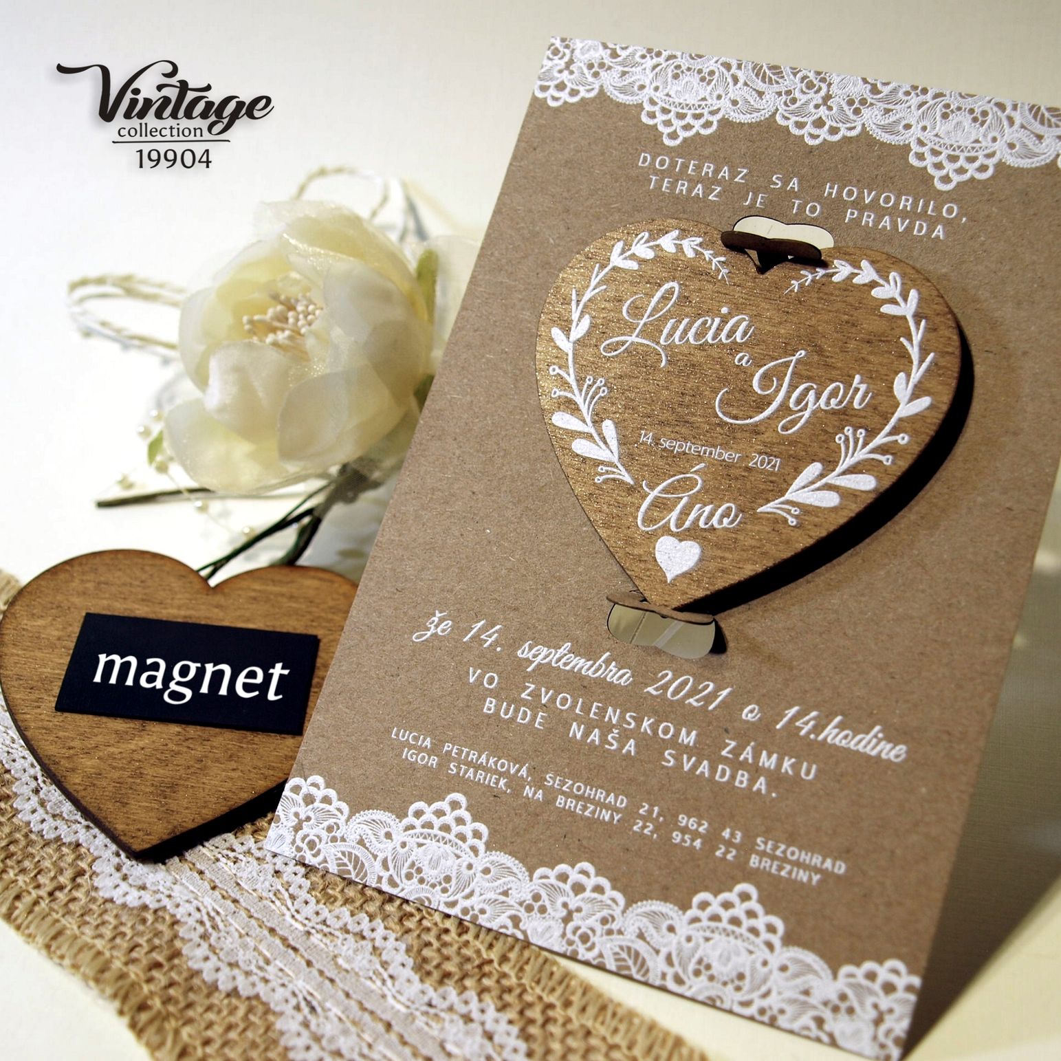 Nové svadobné oznámenie 19904 s magnetkou. Svadobné oznámenie v štýle VINTAGE tlačené na prírodnom papieri výnimočnou 3D bielou tlačou. Písmenká a aj ornament je vystúpený – na papieri vyzerá plasticky. Drevená magnetka je potlačená bielou 3D tlačou. Magnetka je v oznámení vložená v západkách – jednoduché vybratie z oznámenia. K oznámeniu dodávame všetky ostatné tlačoviny na Vašu svadbu ( menovky, menu, zasadací poriadok, etikety, visačky , knihy hostí , atď …… )
