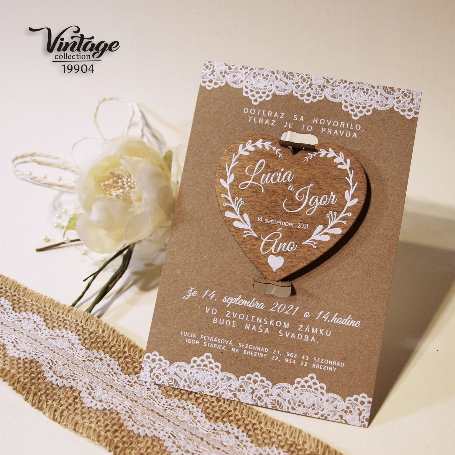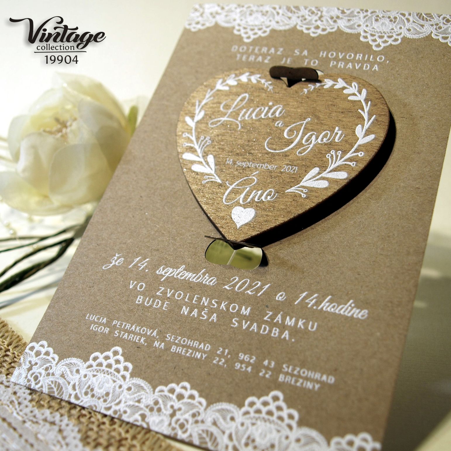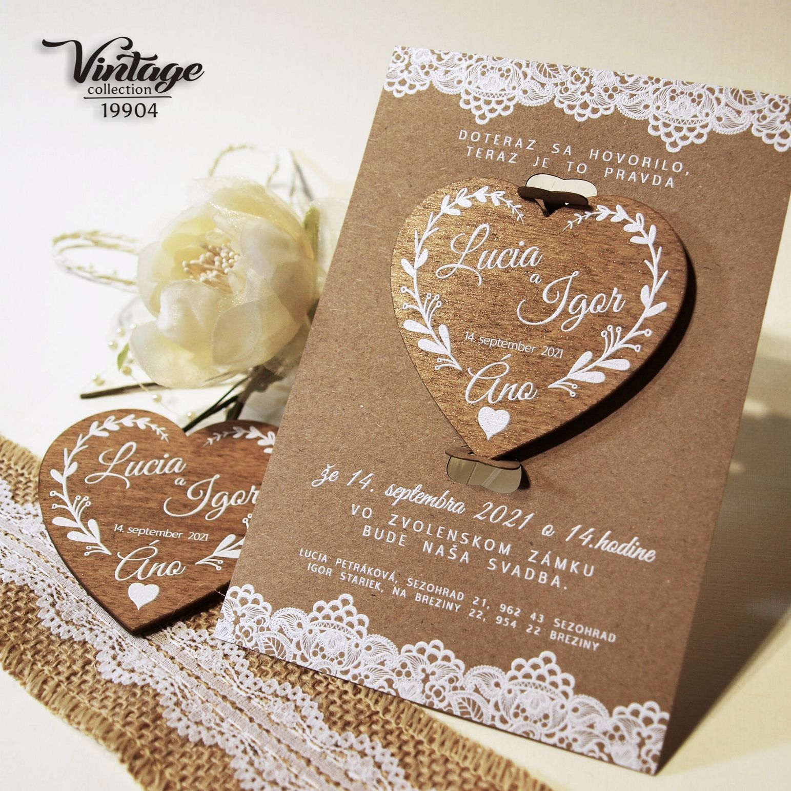 Nové svadobné oznámenie 19904 s magnetkou. Svadobné oznámenie v štýle VINTAGE tlačené na prírodnom papieri výnimočnou 3D bielou tlačou. Písmenká a aj ornament je vystúpený – na papieri vyzerá plasticky. Drevená magnetka je potlačená bielou 3D tlačou. Magnetka je v oznámení vložená v západkách – jednoduché vybratie z oznámenia. K oznámeniu dodávame všetky ostatné tlačoviny na Vašu svadbu ( menovky, menu, zasadací poriadok, etikety, visačky , knihy hostí , atď …… )
