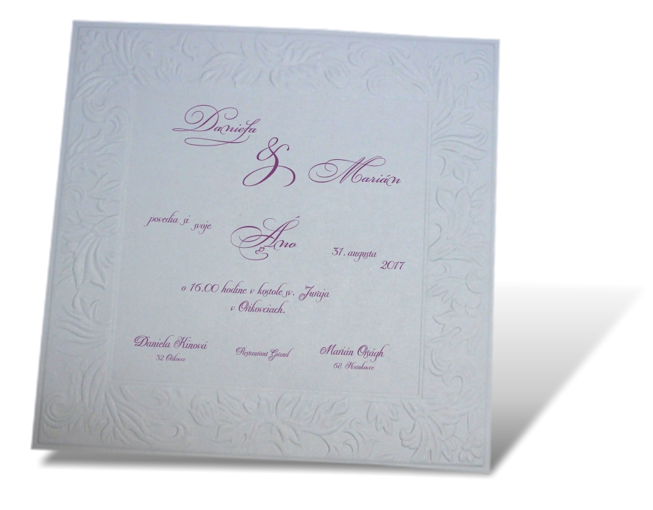 Svadobné oznámenia z bieleho matného papiera s reliéfnou 3D ražbou. Rozmer karty: 170x170mm