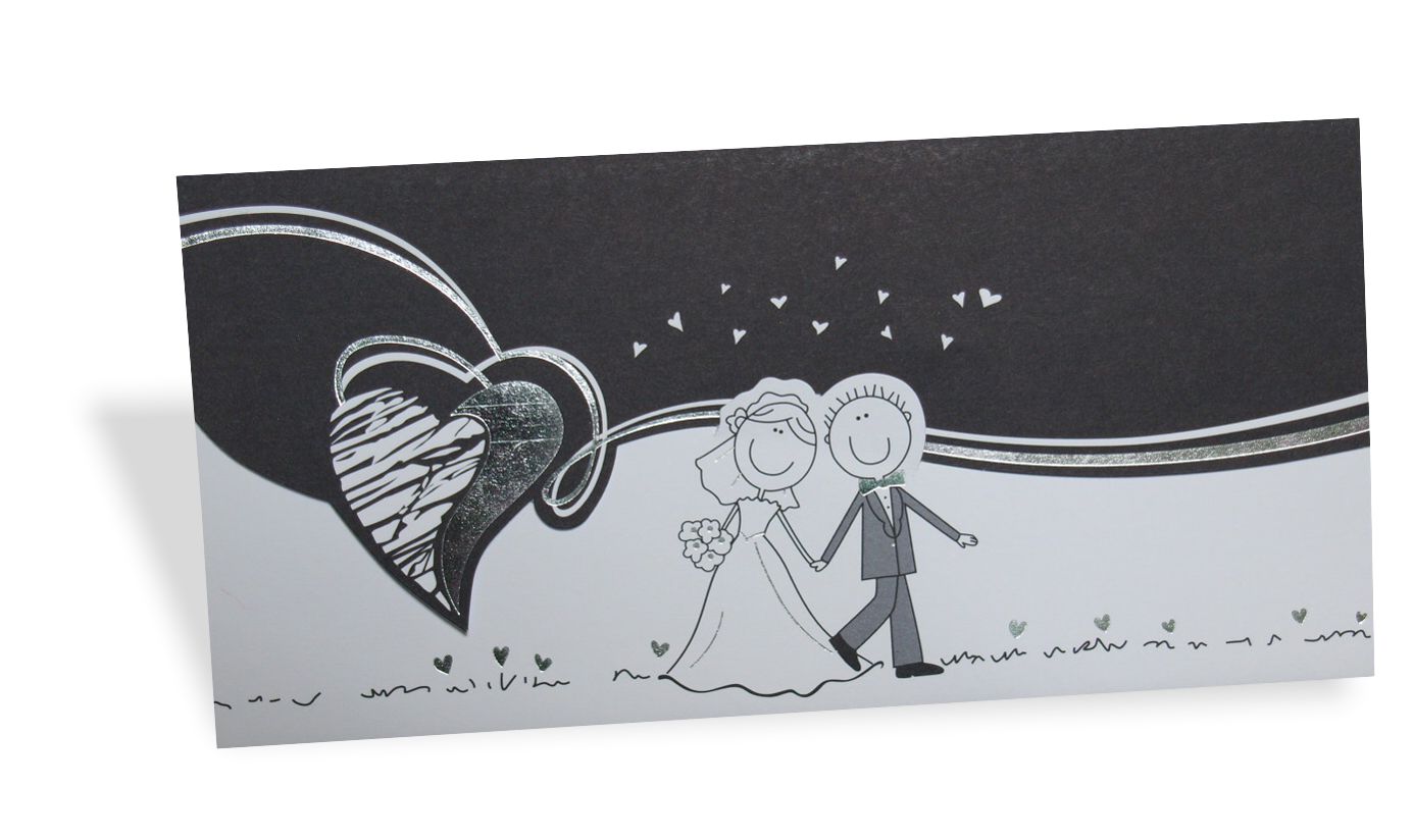 Svadobné oznámenia s tvarovým výsekom z bieleho matného papiera. Oznámenie je potlačené ofsetom a striebornou termoražbou. Rozmer zloženej karty: 195×95 mm