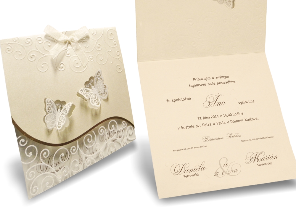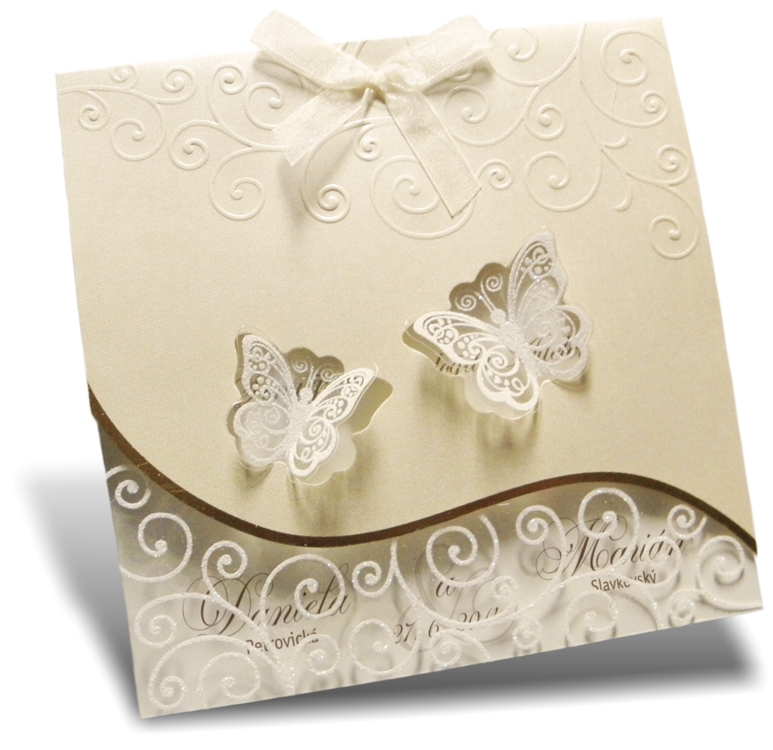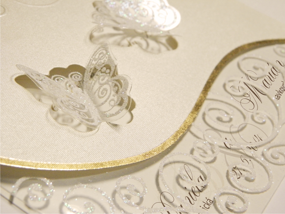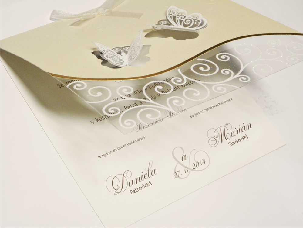 Oznámenie s tvarovým výsekom z krémového metalického papiera + transparentná fólia z výsekom motýľov. Obal oznámenia s 3D ražbou ornamentov a termoražbou so zlatou fóliou doplnená krémovou ozdobnou mašľou. Transparentná fólia potlačená bielym trblietavým glistrom. Texty oznámenia natlačené efektnou termogravúrou. K oznámeniu sa v tomto štýle vyrábajú aj ostatné tlačoviny na svadbu.