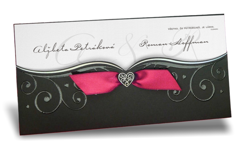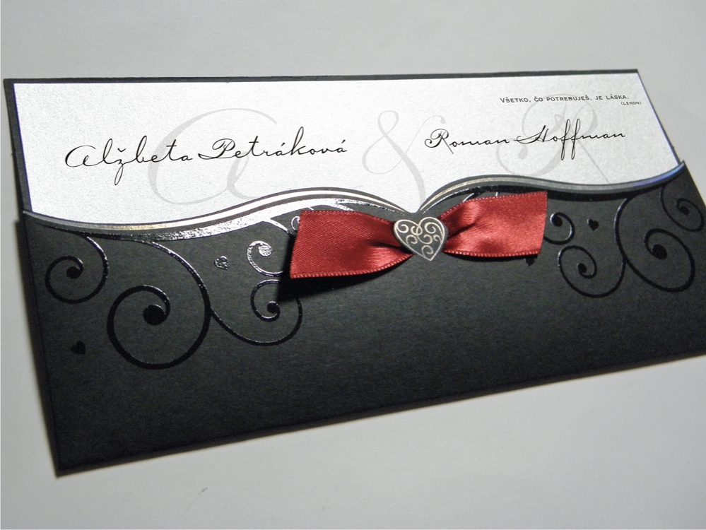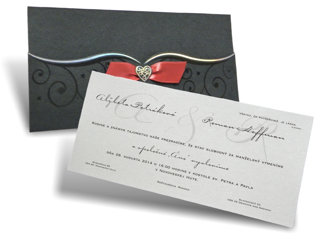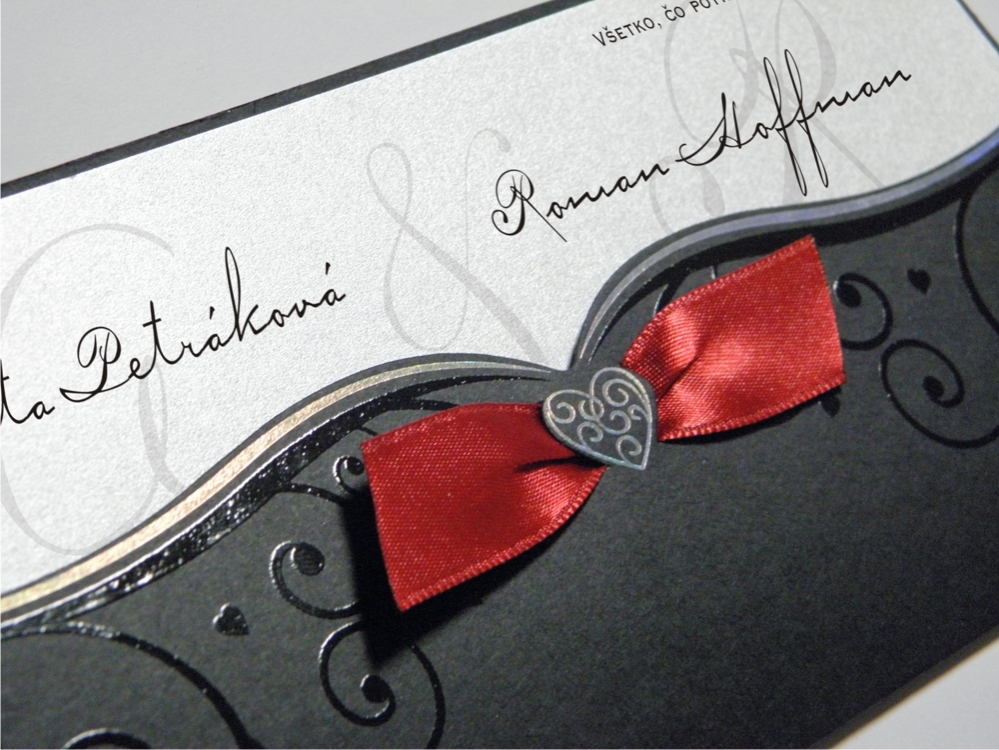 Oznámenie s tvarovým výsekom. Obal vyrobený z čierneho matného papiera s lesklou potlačou transparentnou termogravúrou. Do obalu je vsadená ozdobná stuha.