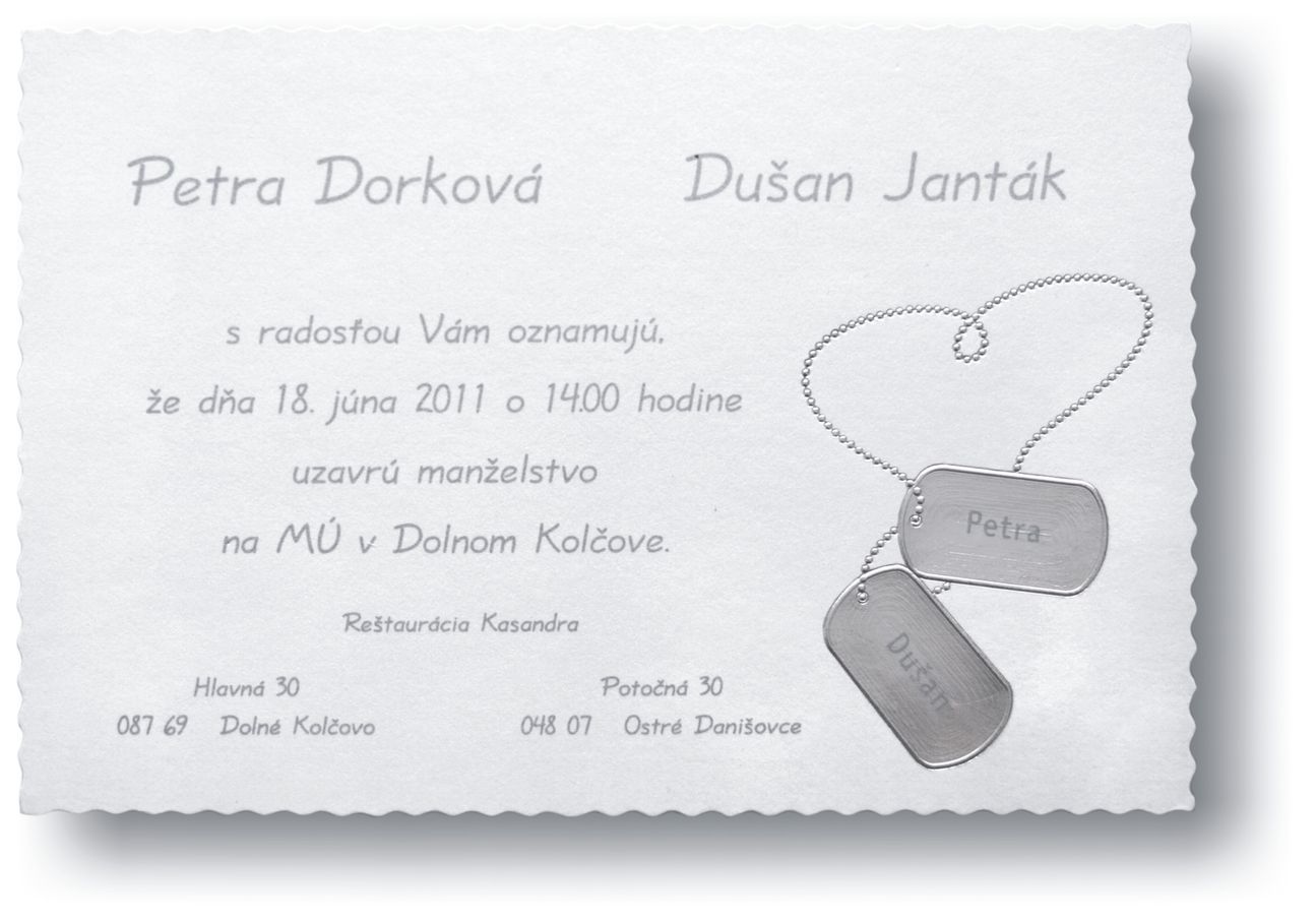 Svadobné oznámenia zo strieborného metalického papiera s tvarovým výsekom a 3D striebornou ražbou vojenských známok. Rozmer svadobného oznámenia: 150×100 mm