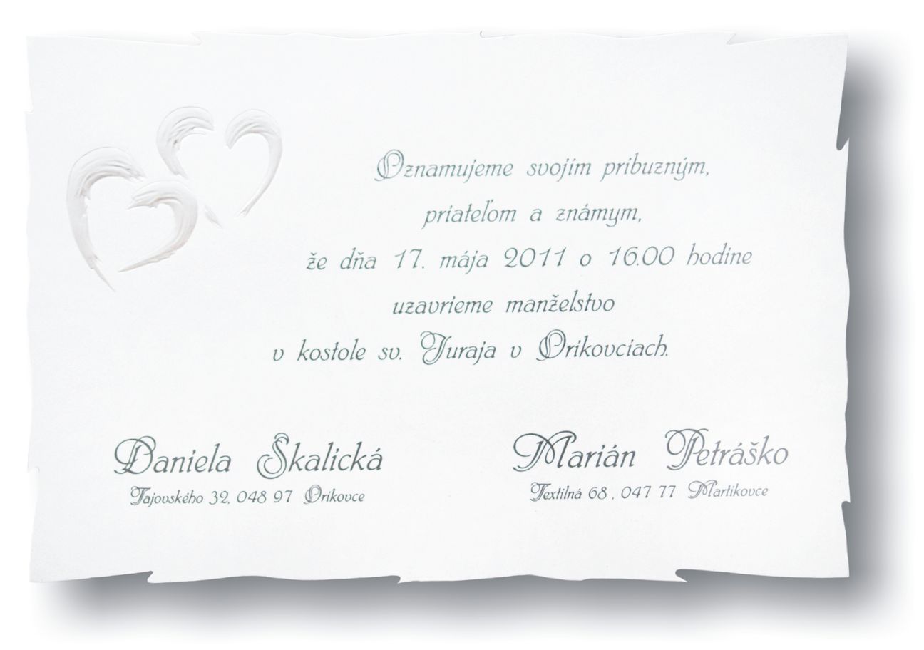 Svadobné oznámenia s tvarovým výsekom z bieleho papiera s jemnými, lesklými perleťovými bodkami, ktoré je dozdobné srdiečkami z perleťovej 3D ražby. Rozmer svadobného oznámenia: 150c100 mm