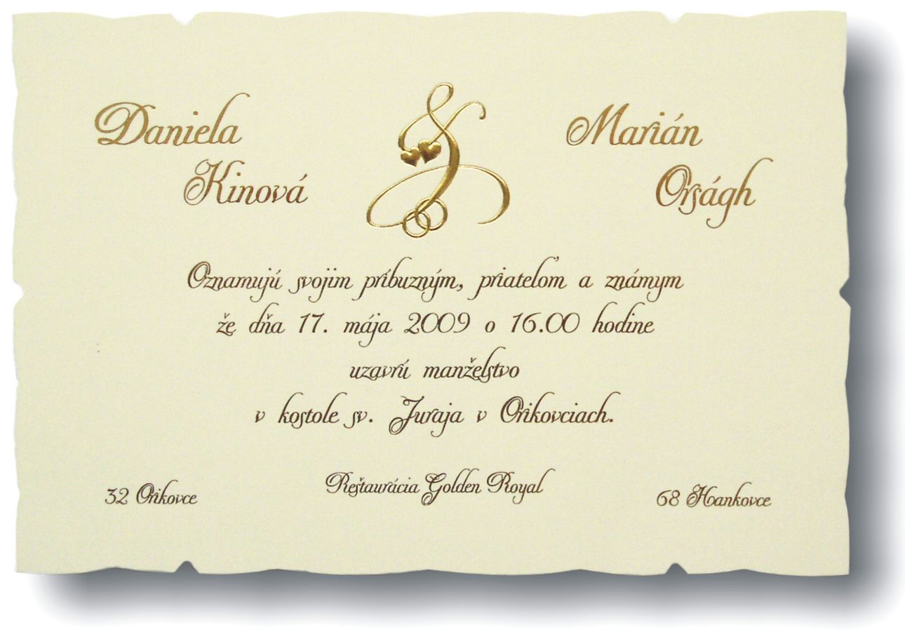 Svadobné oznámenia z krémového, natieraného lesklého papiera s tvarovým výsekom a zlatou 3D ražbou. Text je natlačený zlatou termoražbou. Rozmer svadobného oznámenia: 150×100 mm