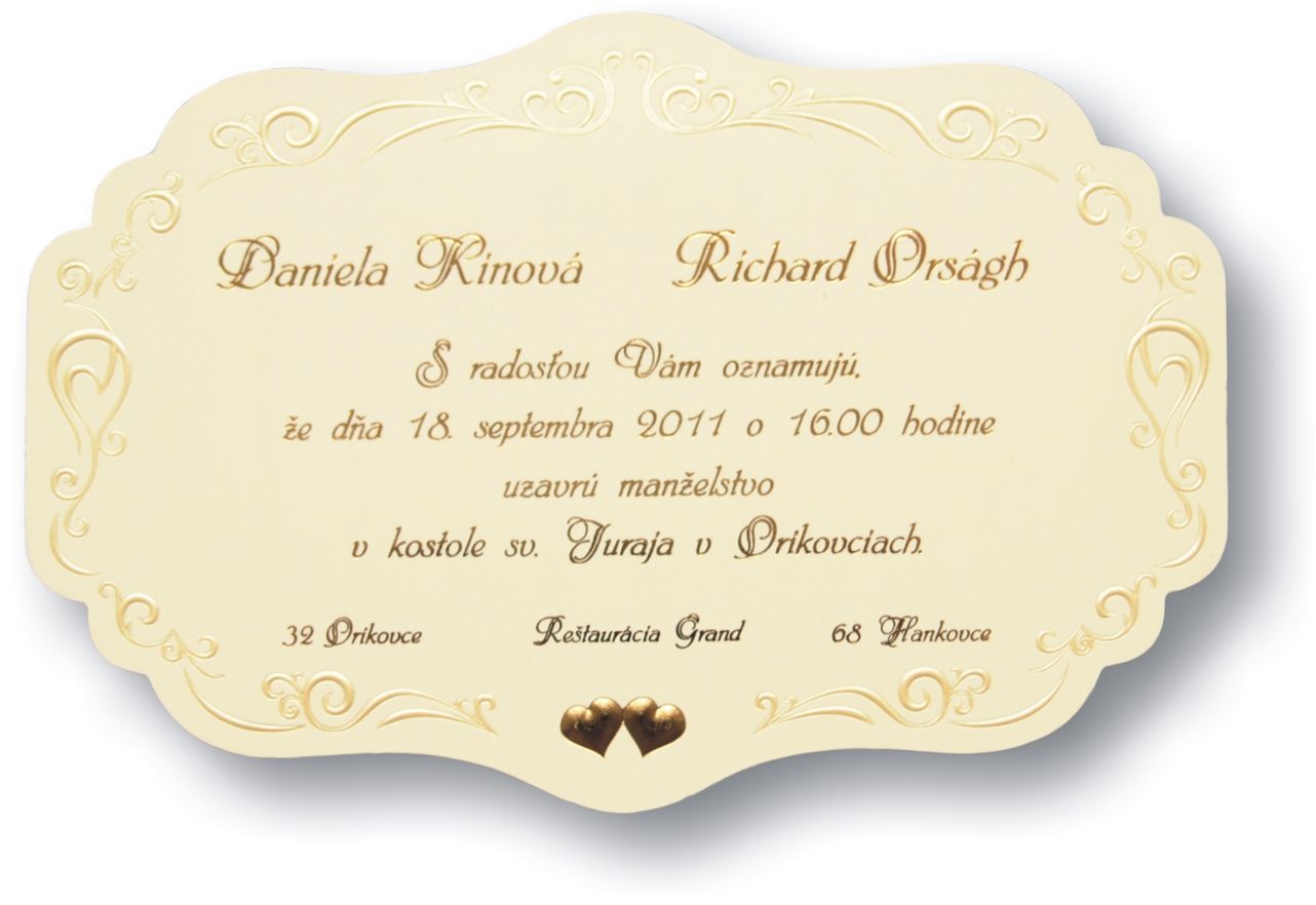 Svadobné oznámenia z krémového natieraného lesklého papiera s tvarovým výsekom a zlatou a perleťovou 3D ražbou. Text je natlačený zlatou termoražbou. Rozmer svadobného oznámenia: 150×100 mm