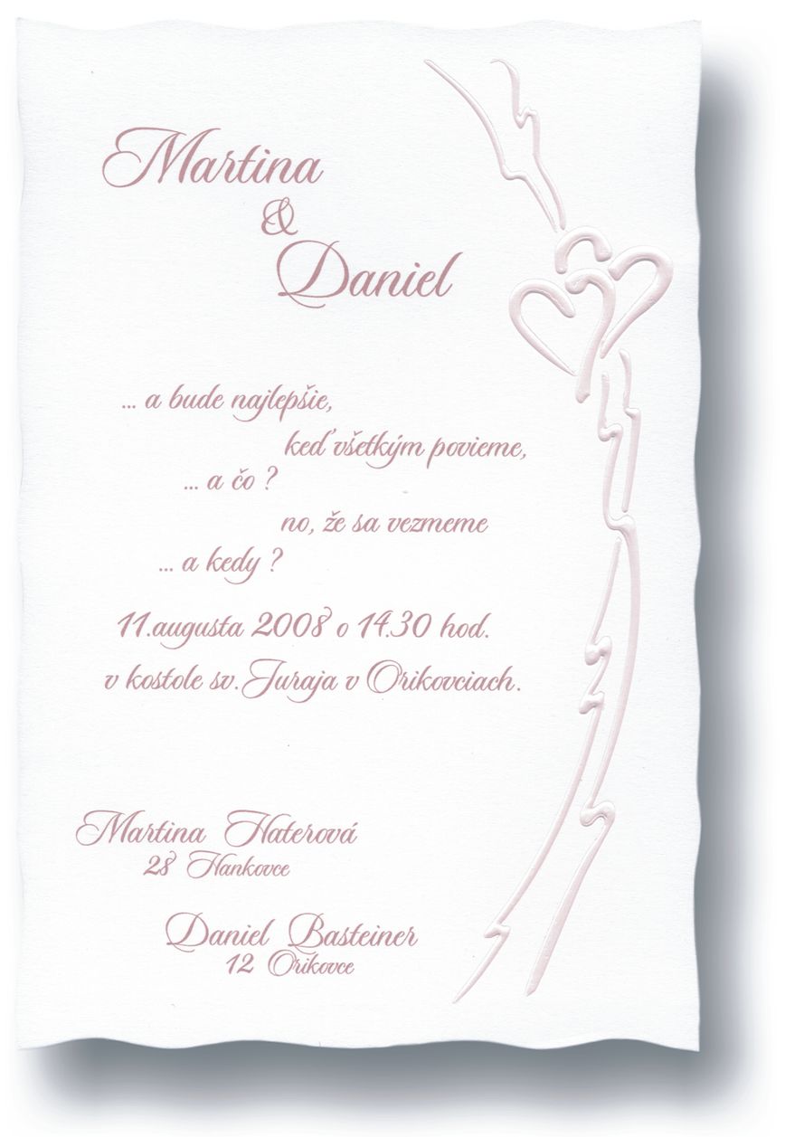 Svadobné oznámenia z extra bieleho papiera s tvarovým výsekom a ružovou 3D ražbou. Rozmer svadobného oznámenia: 100×150 mm
