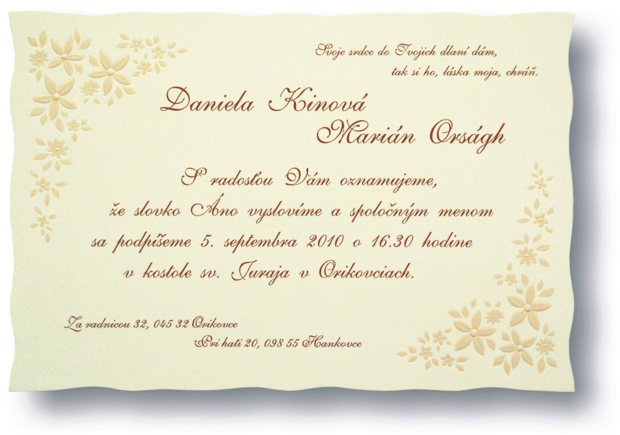 Všetky možnosti a parametre svadobného oznámenia je možné uviesť a doplniť aj pri emailovej komunikácii počas schvaľovania grafického návrhu.
