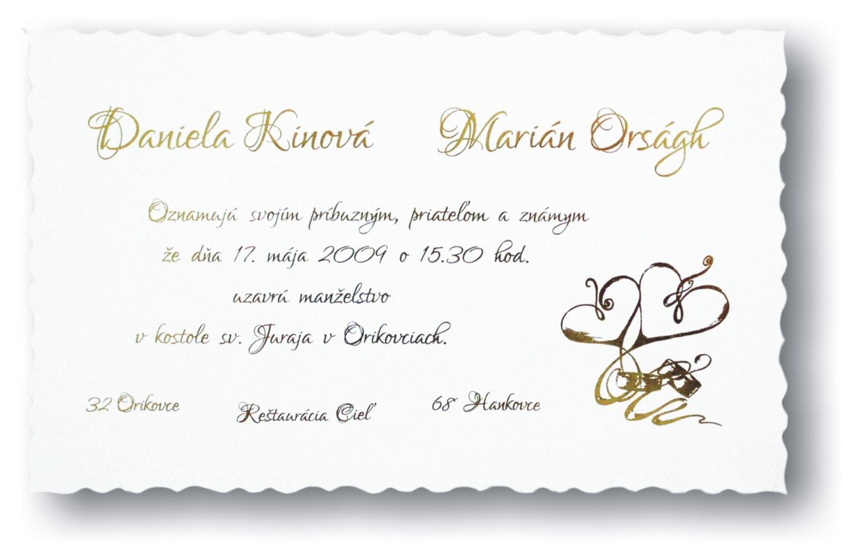 Svadobné oznámenia z bieleho natieraného lesklého papiera s tvarovým výsekom. Text je natlačený zlatou termoražbou. Rozmer svadobného oznámenia:135×80 mm