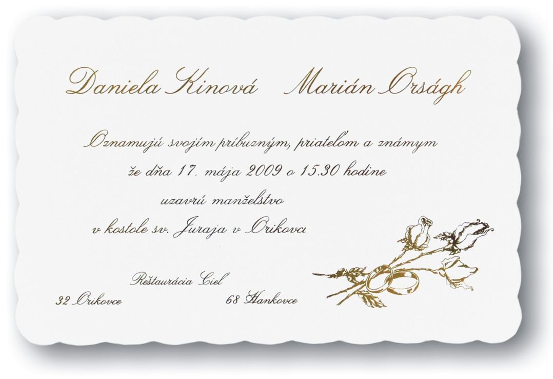 Svadobné oznámenia z bieleho natieraného lesklého papiera s tvarovým výsekom. Text je natlačený zlatou termoražbou. Rozmer svadobného oznámenia:135×85 mm