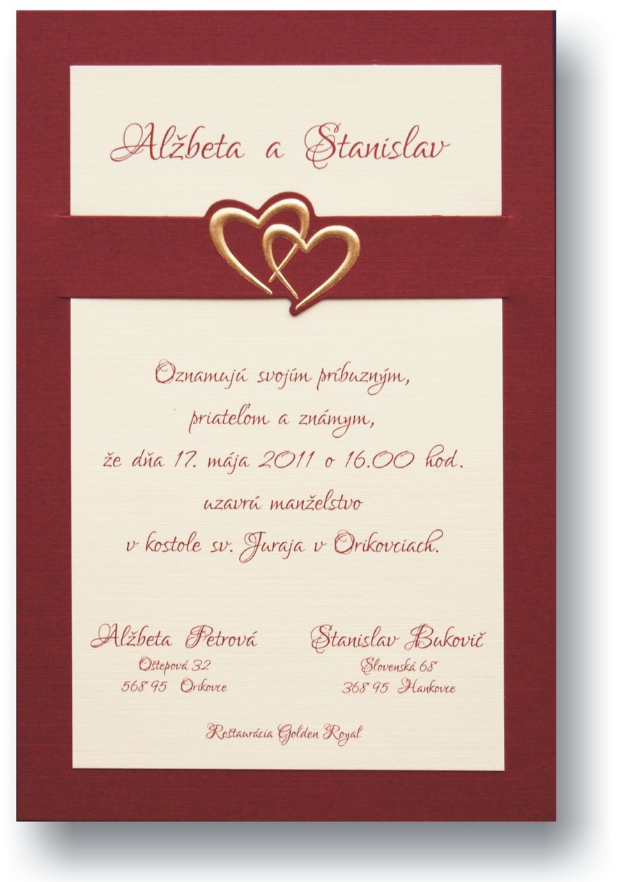 Svadobné oznámenia z bordového papiera s tvarovým výsekom a zlatou 3D ražbou. Text je natlačený na prírodnom krémovom papieri s obojstrannou ražbou pripomínajúcou plátno. Rozmer svadobného oznámenia: 100×150 mm