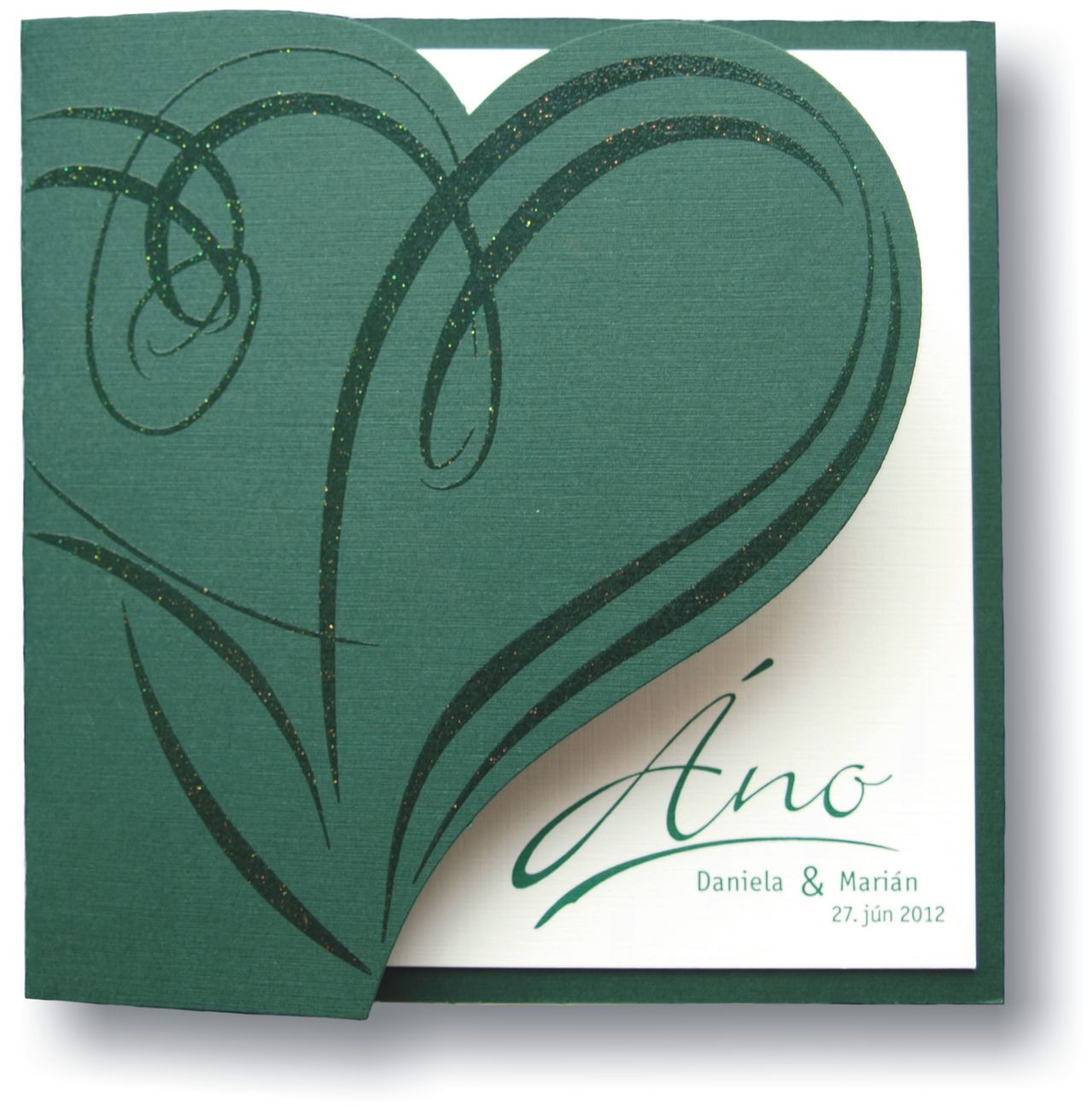 Otváracie svadobné oznámenia s tvarovým výsekom zo zeleného papiera s obojstrannou ražbou pripomínajúcou plátno s trblietavou termogravúrou na prednej strane. Text je natlačený na bielom papieri s obojstrannou ražbou pripomínajúcou plátno. Rozmer zloženého svadobného oznámenia: 145×145 mm
