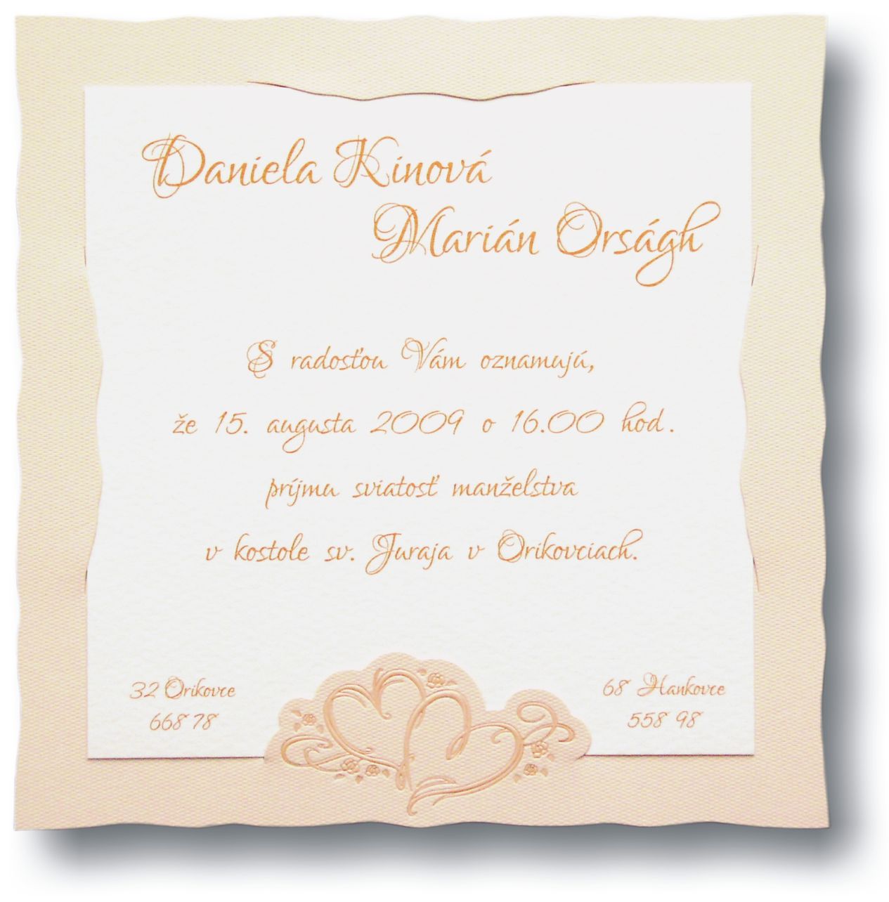 Svadobné oznámenia s tvarovým výsekom z oranžového papiera s perleťovou 3D ražbou. Text je natlačený na bielom prírodnom papieri s jemnou obojstrannou štruktúrou. Rozmer svadobného oznámenia: 145×145 mm