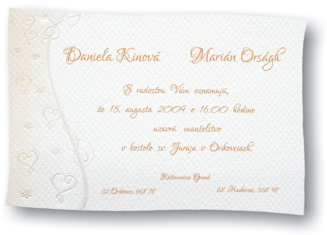 Svadobné oznámenia z bieleho prírodného papiera s jemnou obojstrannou štruktúrou s tvarovým výsekom a perleťovou 3D ražbou. Rozmer svadobného oznámenia: 150×100 mm