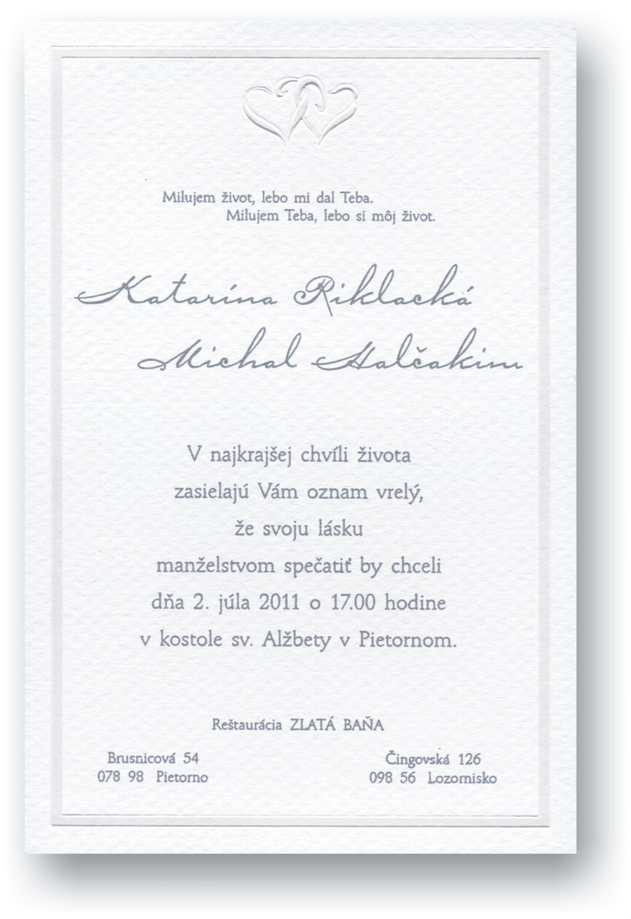 Svadobné oznámenia z bieleho prírodného papiera s jemnou obojstrannou štruktúrou s bielou perleťovou 3D ražbou. Rozmer svadobného oznámenia: 100×150 mm