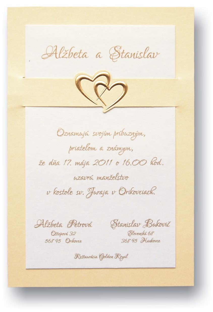 Svadobné oznámenia z zlatého papiera s tvarovým výsekom a zlatou 3D ražbou. Text je natlačený na striebornom metalickom papieri. Rozmer svadobného oznámenia: 100×150 mm