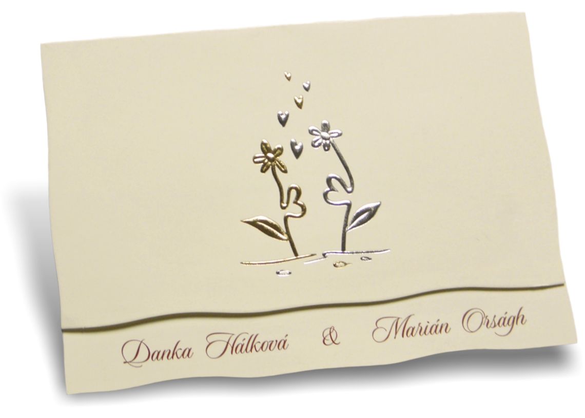 Svadobné oznámenia z krémového natieraného lesklého papiera s tvarovým výsekom a zlatou a striebornou 3D ražbou. Rozmer zloženého svadobného oznámenia: 150×100 mm