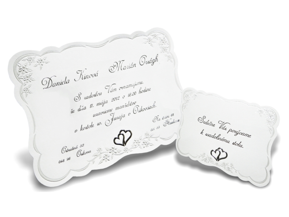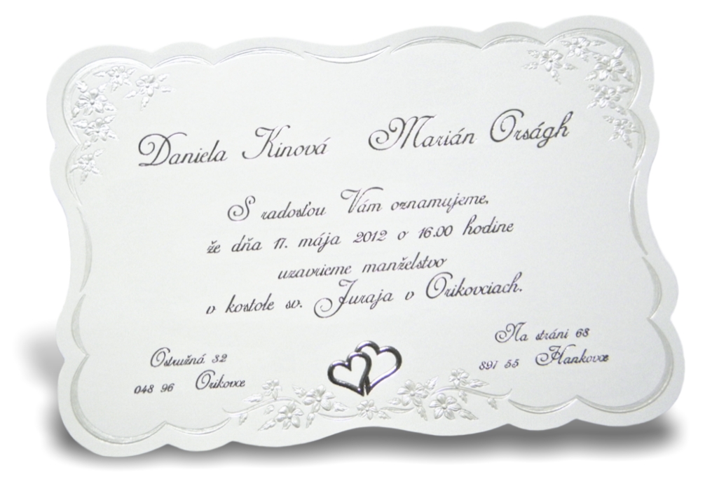 Oznámenie s tvarovým výsekom na bielom papiery.
