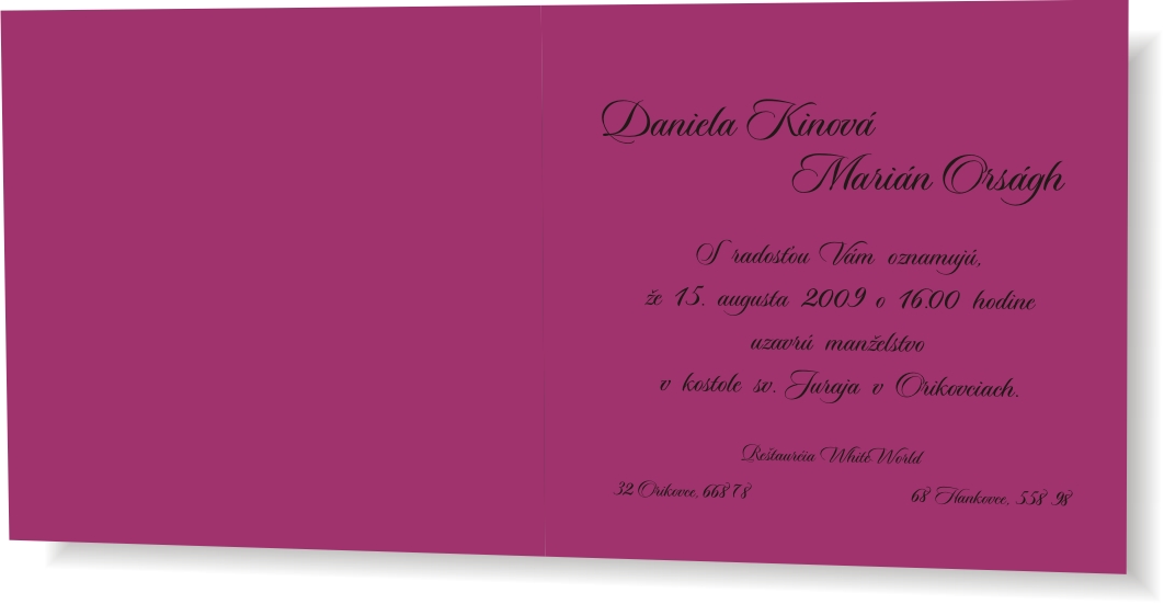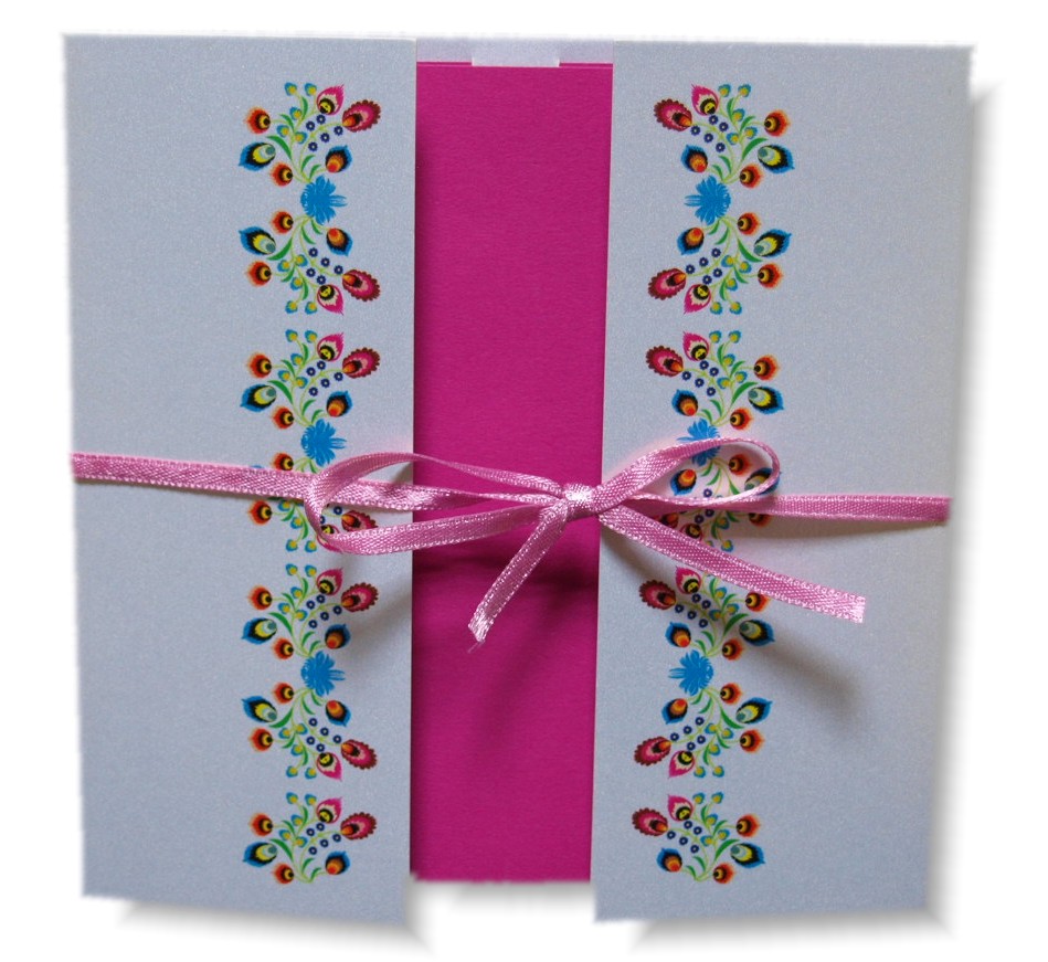 Otváracie svadobné oznámenie z metalického papiera s farebnou potlačou. Text sa tlačí na výrazný ružový papier. Oznámenie je zviazané tenkou ružovou stuhou. Text sa tlačí efektnou termogravúrou. Rozmer zloženej karty: 135×135 mm