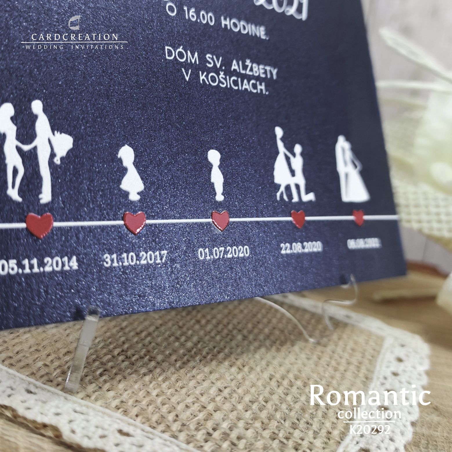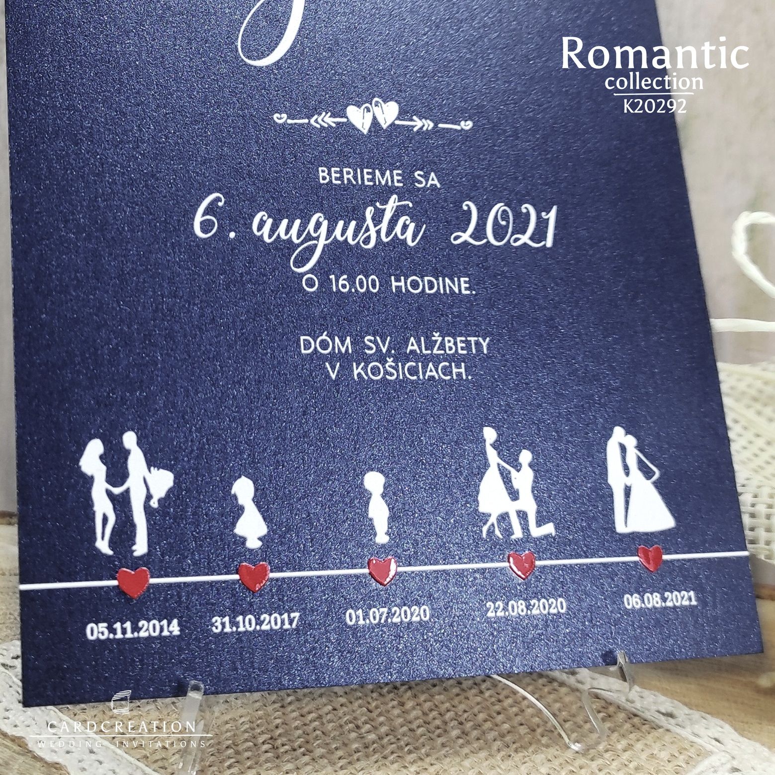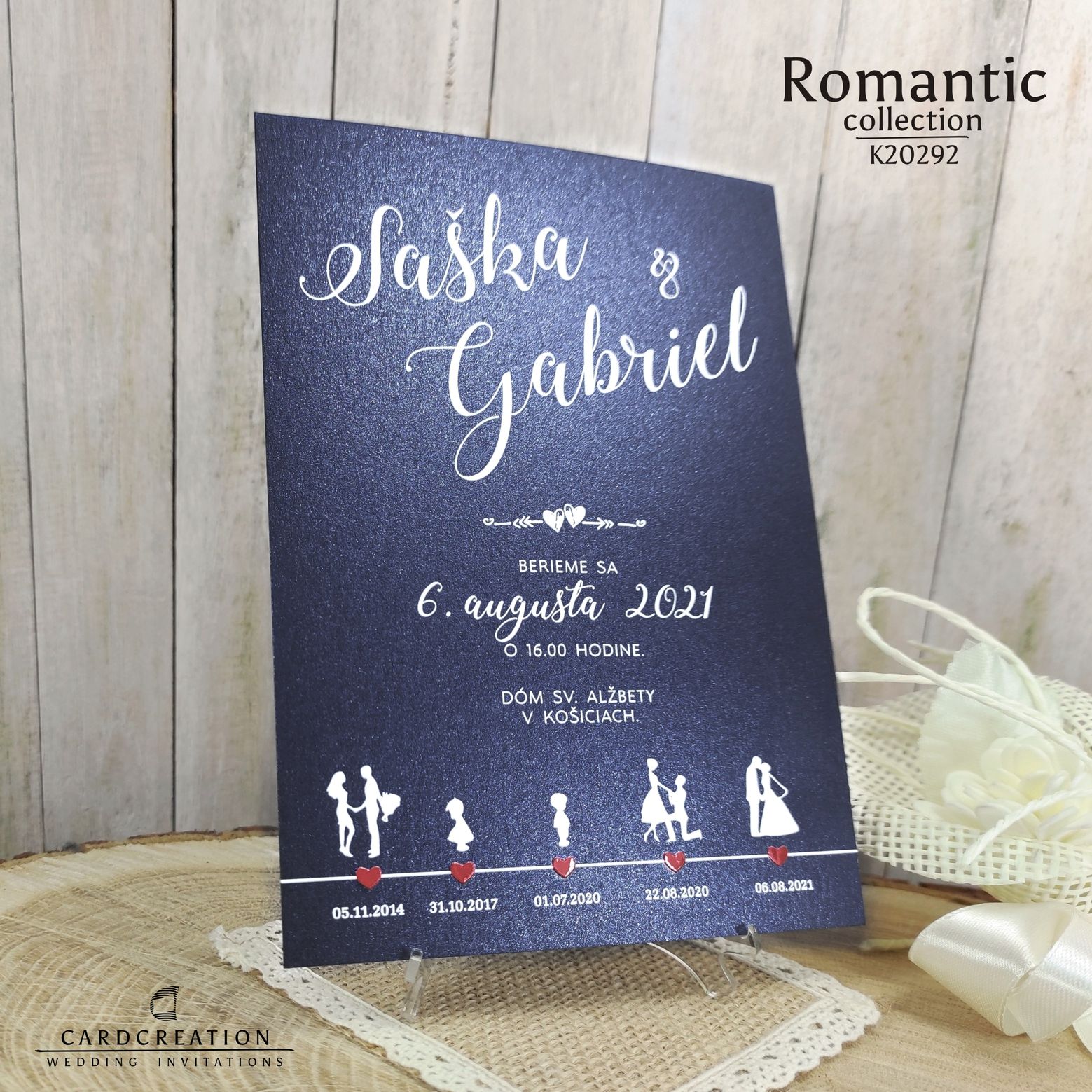 Svadobné oznámenie s originálnym dizajnom, vytlačené na luxusnom grafickom papieri s využitím najnovších technológii potlače. Na oznámení môžete zachytiť Váš príbeh lásky od jej začiatkov až po veľký svadobný deň. Oznámenie vyniká 3D plastickou vystúpenou tlačou textov a srdiečok. Po prechode palcom po srdiečkach budete môcť cítiť, že atrament vystupuje z podkladu. Oznámenie je tlačené vo vysokej fotokvalite s dôrazom na detail. V cene oznámenia je zmena mien, dátumu a miesta konania svadby. Zrealizujeme aj Vaše grafické nápady a predstavy. K oznámeniu vám vieme vytlačiť v rovnakom dizajne aj pozvánky a samozrejme všetky ostatné svadobné tlačoviny.