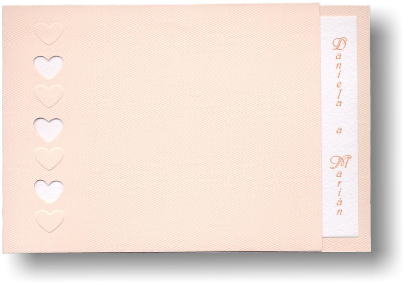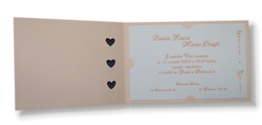 Otváracie svadobné oznámenie z oranžového papiera s výsekom srdiečok a reliéfnou ražbou. Do vnútra sa zakladá karta z bieleho prírodného papiera. Rozmer zloženej karty: 150×100 mm