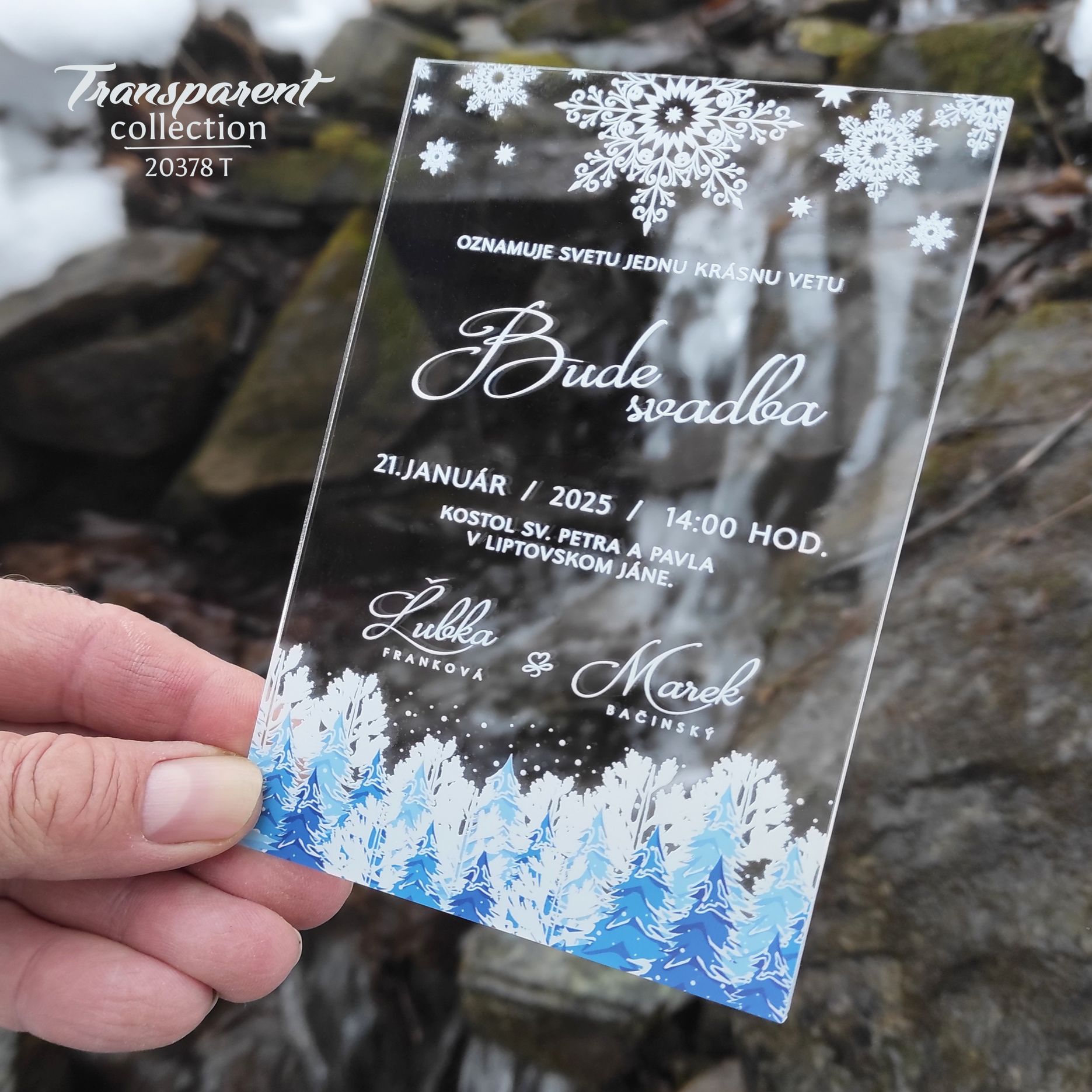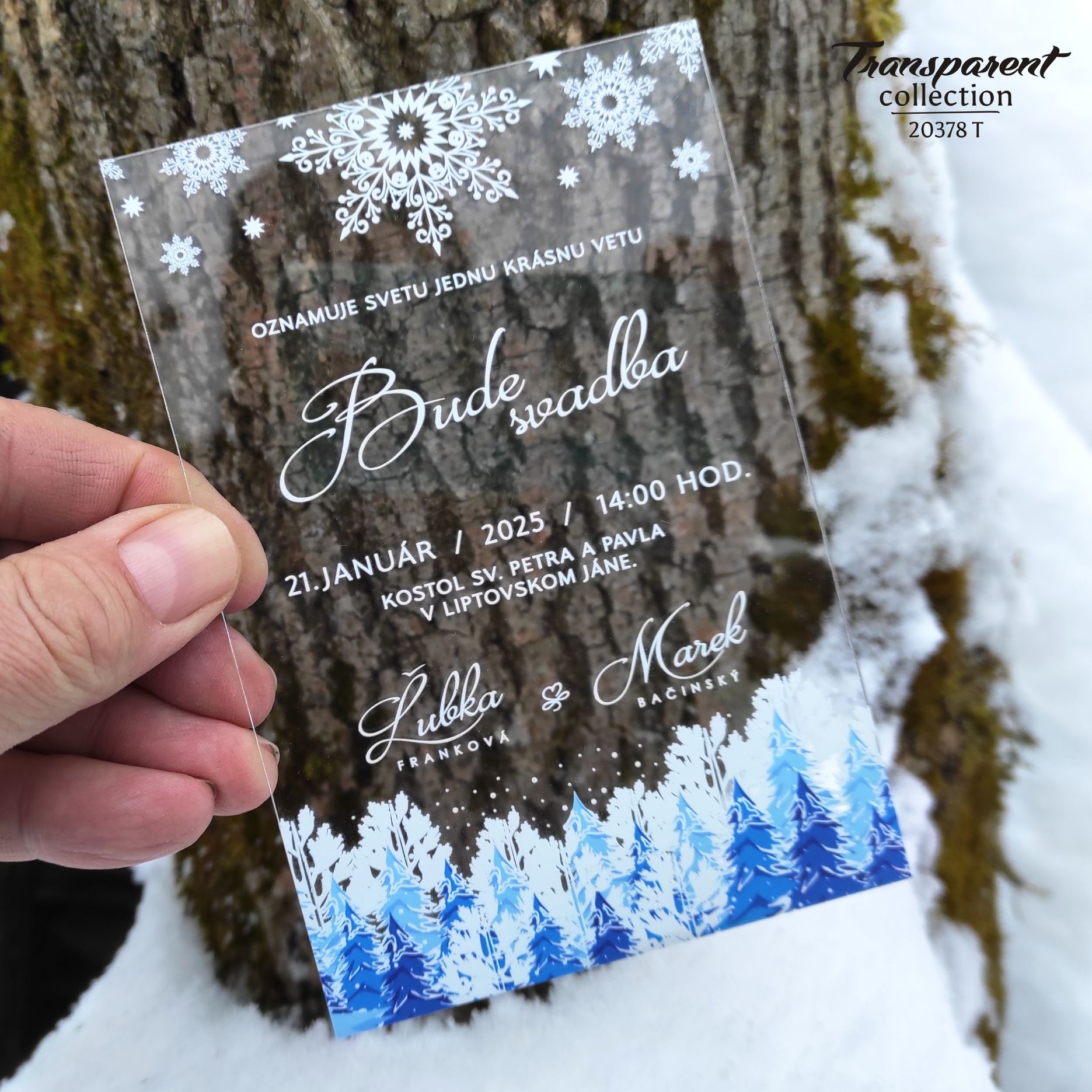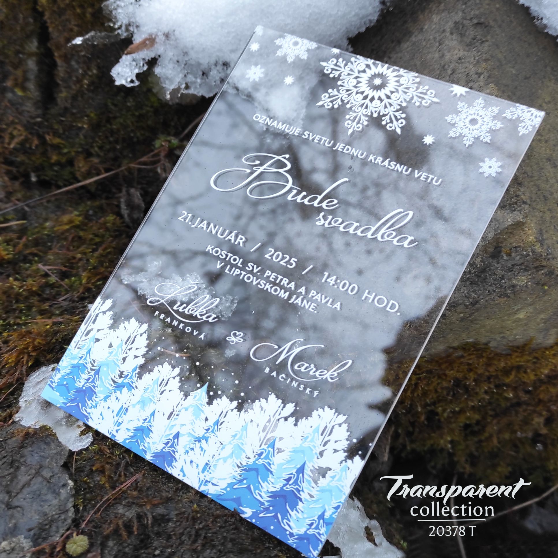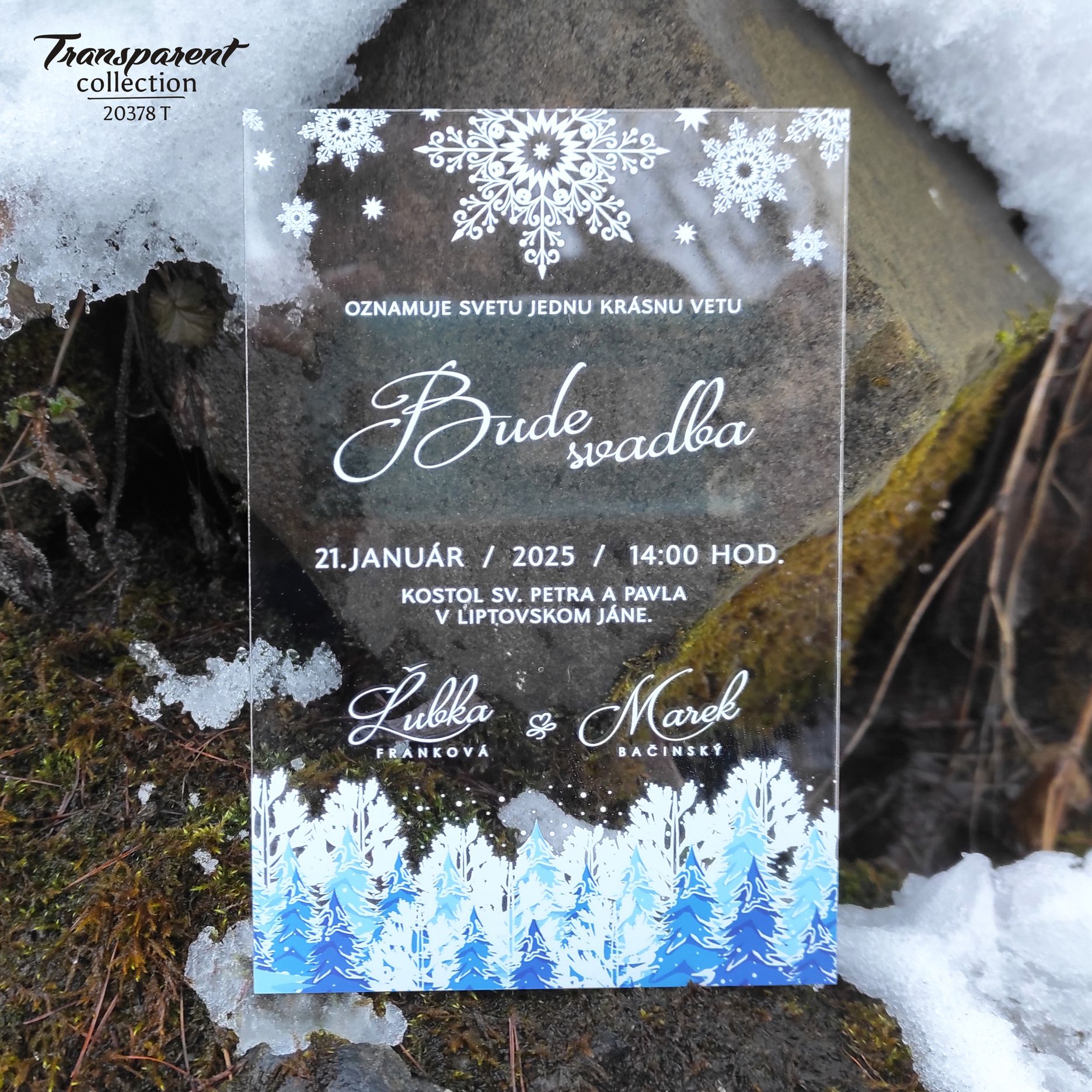 Transparentné oznámenie Jedlička na Vašu rozprávkovú zimnú svadbu. Oznámenie typu M20378T Vám prináša dokonalú tlač najvyššej kvality s využitím až 8 farebnej škály CMYKLCLM + biela a lak. Vďaka využitiu technológie 3D plastickej vystúpenej tlače, môžete dostať luxusné oznámenia, z ktorých budú texty a grafiky vystupovať. Oznámenie je tlačené na dymový akryl.